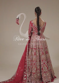 Everyone wants to be a red bride on their big day and Shurooq has got you covered this wedding season. ‘Desirée’ echoes that timeless charm of red bridals but with a redefined look. Out with the all-gold work, we have mixed silver beadwork with dull gold for a received finish. Accents of blazing orange and earthy greens give this bridal a lift into a category of its own. Bespoke bridals are all about a showstoping style statement and Shurooq Brides know that their bridal fantasies are always our priority.