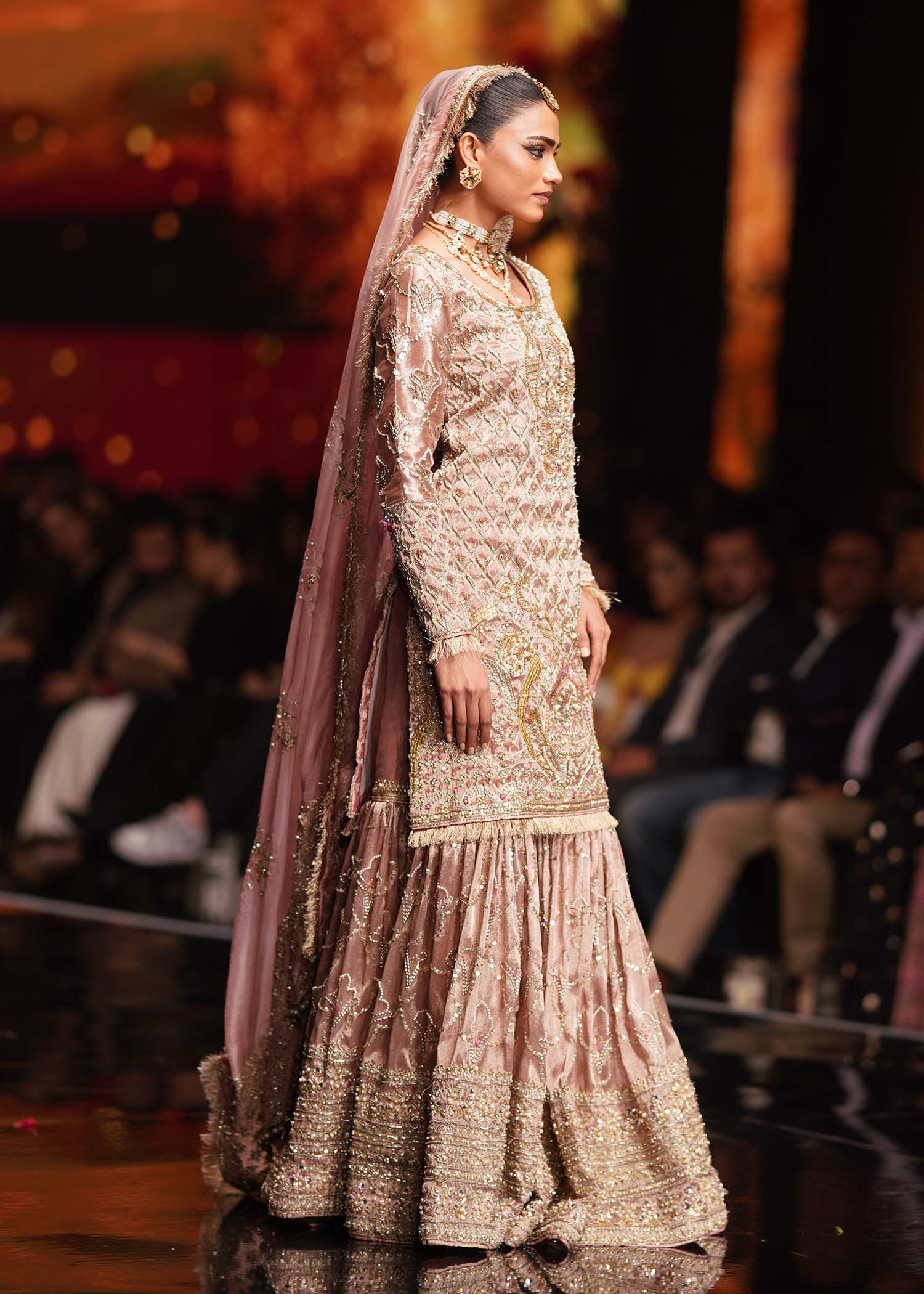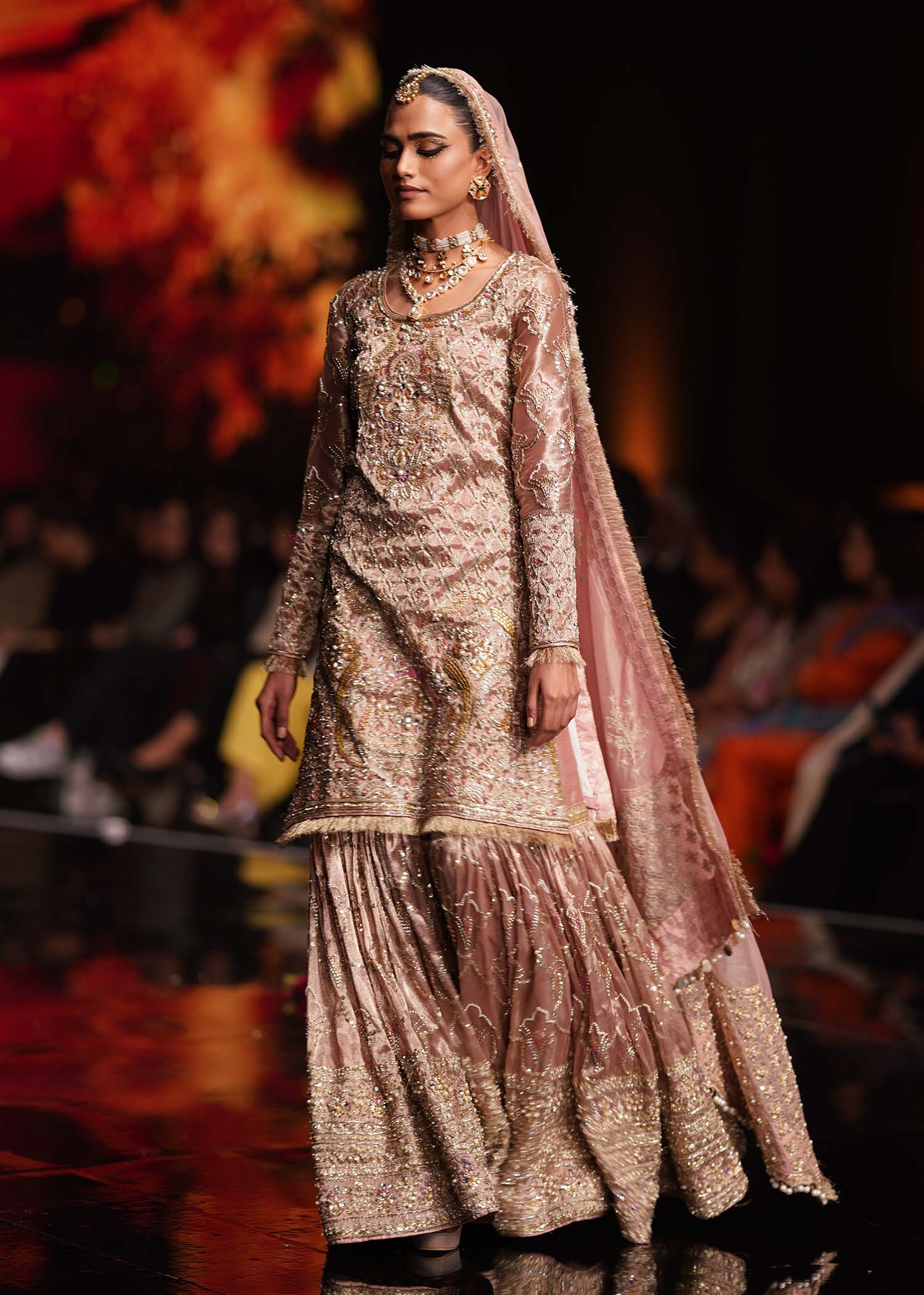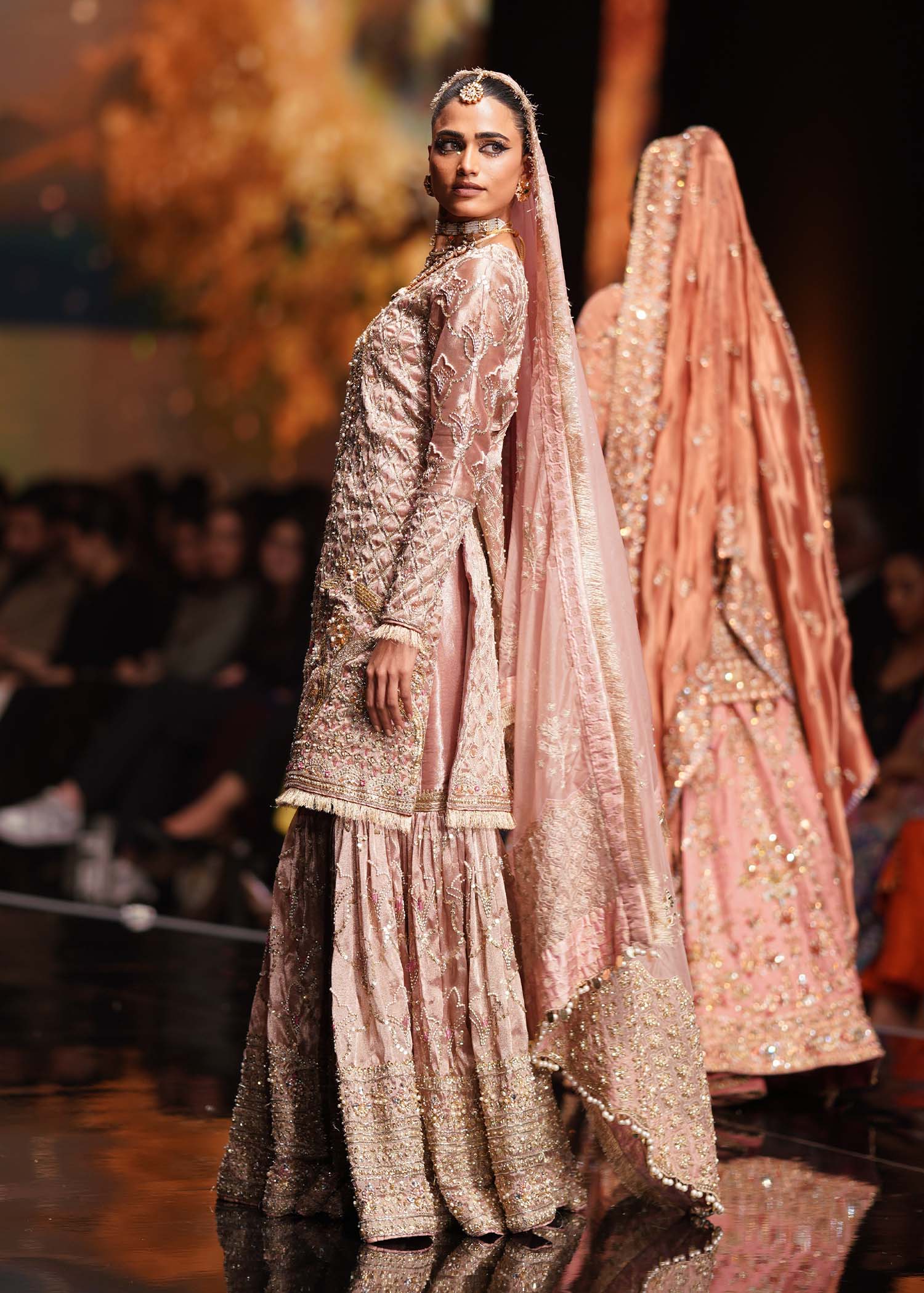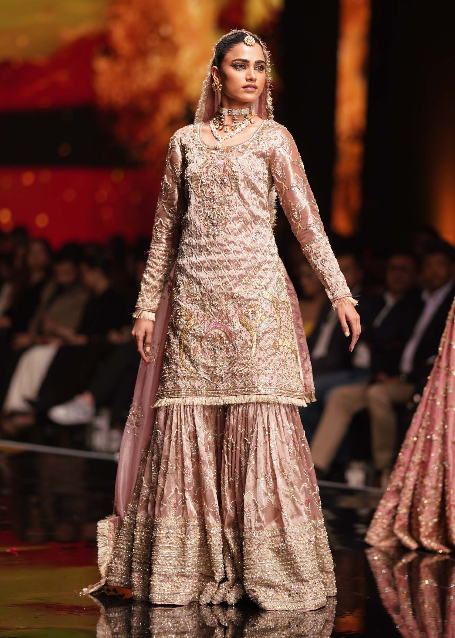 A masterpiece to behold ‘Margo’ is sure to steal hearts this season. Made exclusively on tissue, this tes pink creation is all about traditional ornamentation and the most stunningly intricate handwork on the shirt and gharara. A floral jaal is harmoniously complemented with thick borders to bring back old glamour. Silver and dull gold embellishments give this an entirely new look with a contemporary flair, this is what Shurooq couture is all about - timeless beauty with a new style.