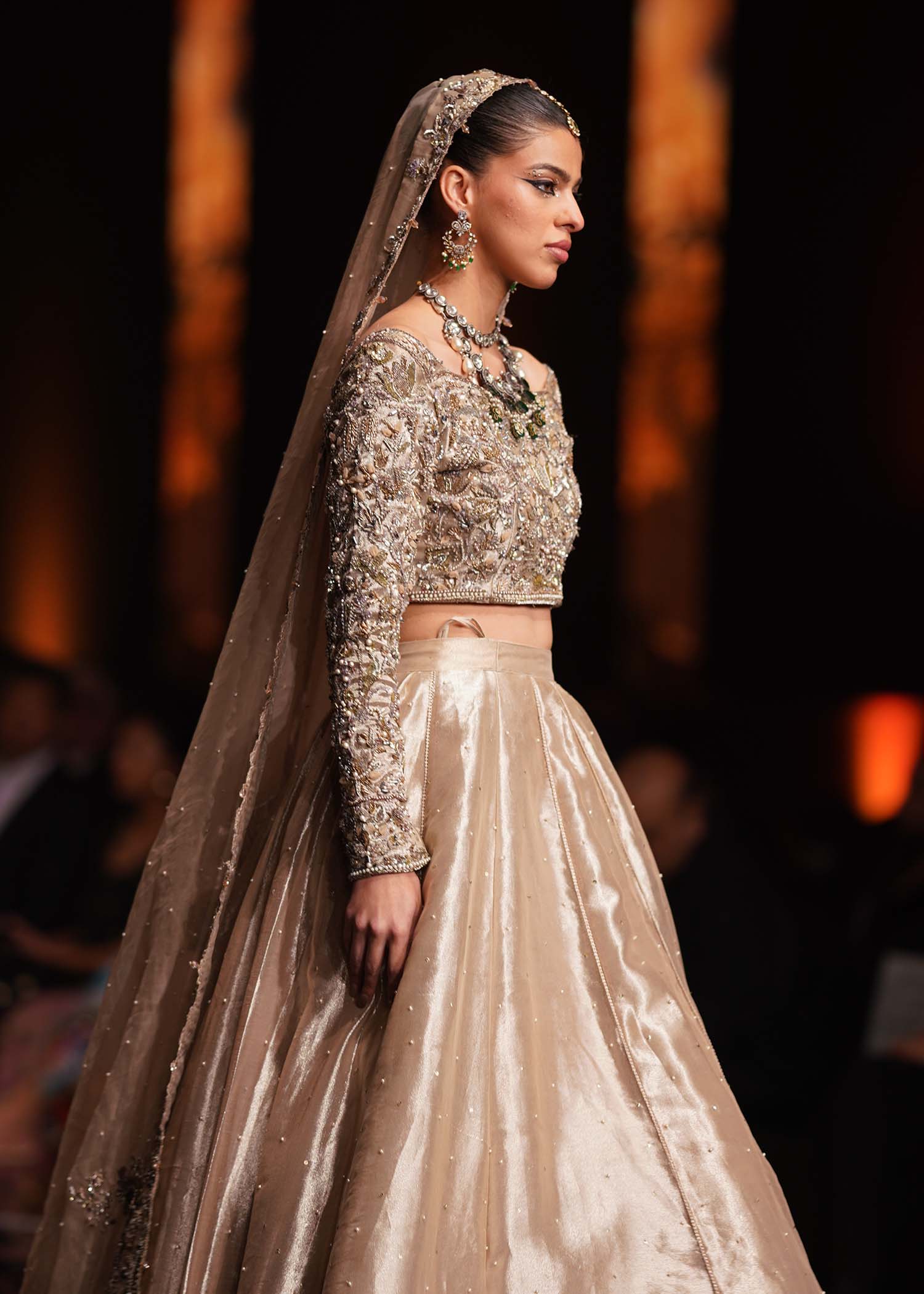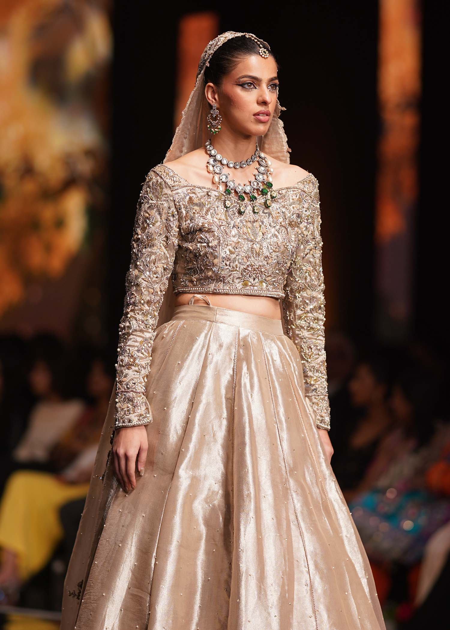 Noor Bano’ is a goddess, the beauty resembling the chandni of the night sky. Her sheen can be seen from a great distance as she sparkles like crystals under a divine light. The lehnga choli set is made from ivory tissue with gold and silver tilla embroideries accented with green and lilac resham embroideries inspired from the exotic flowers of Mughal gardens. Hints of luxe hand applied crystals and pearl beading are scattered throughout the ensemble with ganga jamni zari work. The pure organza dupatta is nothing less than spectacular with floral motifs encrusted with embellished detailing.