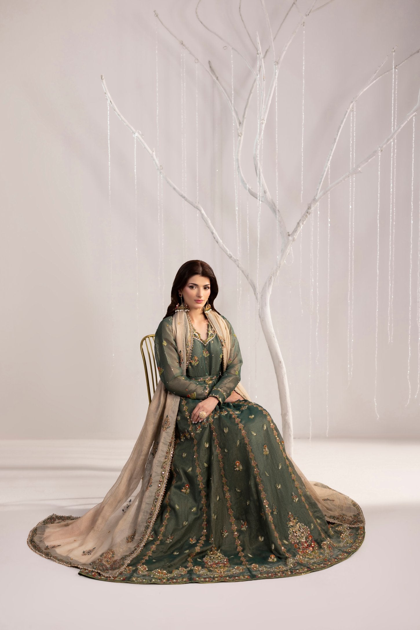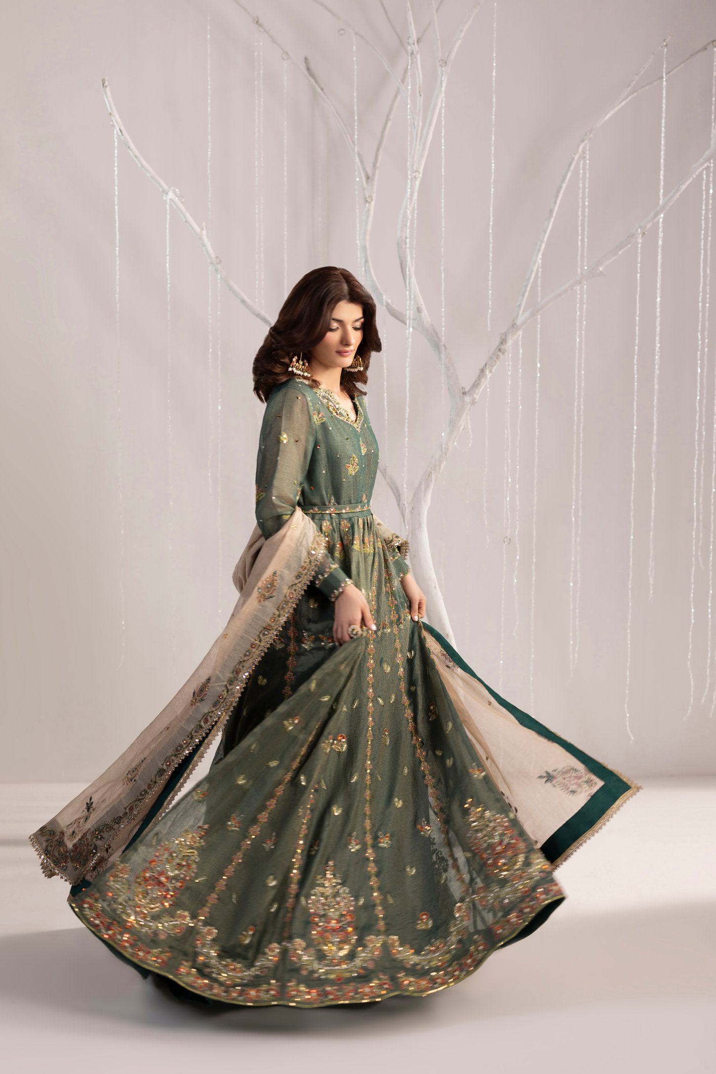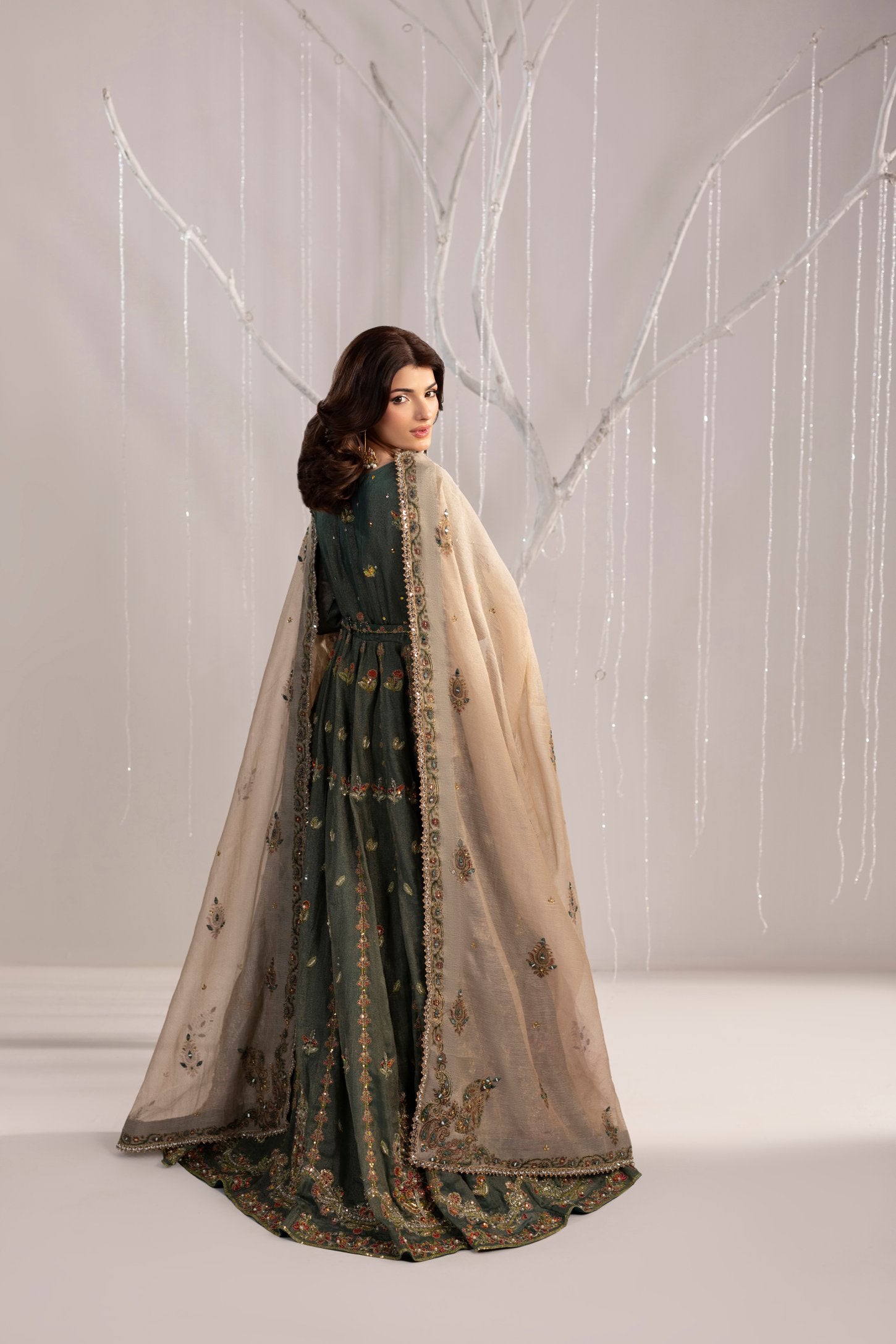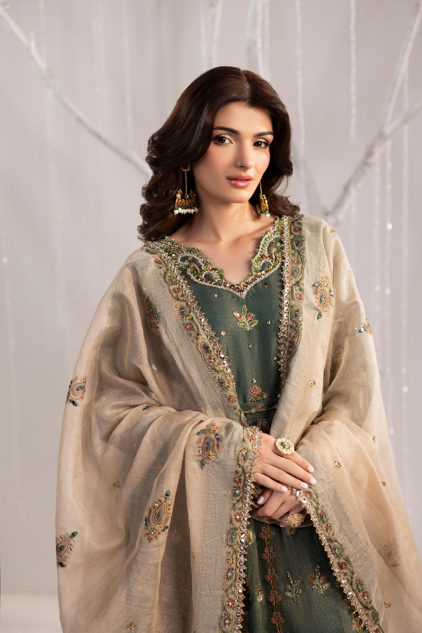 The everlasting and ever so graceful combination of green and gold is once again channeled in Emerald Whisper. Made especially on fine zari cotton net, this green maxi gown is perfect for very occasion with the right amount of embellished charm. Each floral detail tells a story of beauty and elegance while gold subdues its aura. Sequins mimic radiance while crystals sparkle. Fourteen beautifully made and tailored panels complete the flair. A gorgeous dull gold dupatta is paired for the perfect combination and the wow factor to every ensemble with silk trousers.