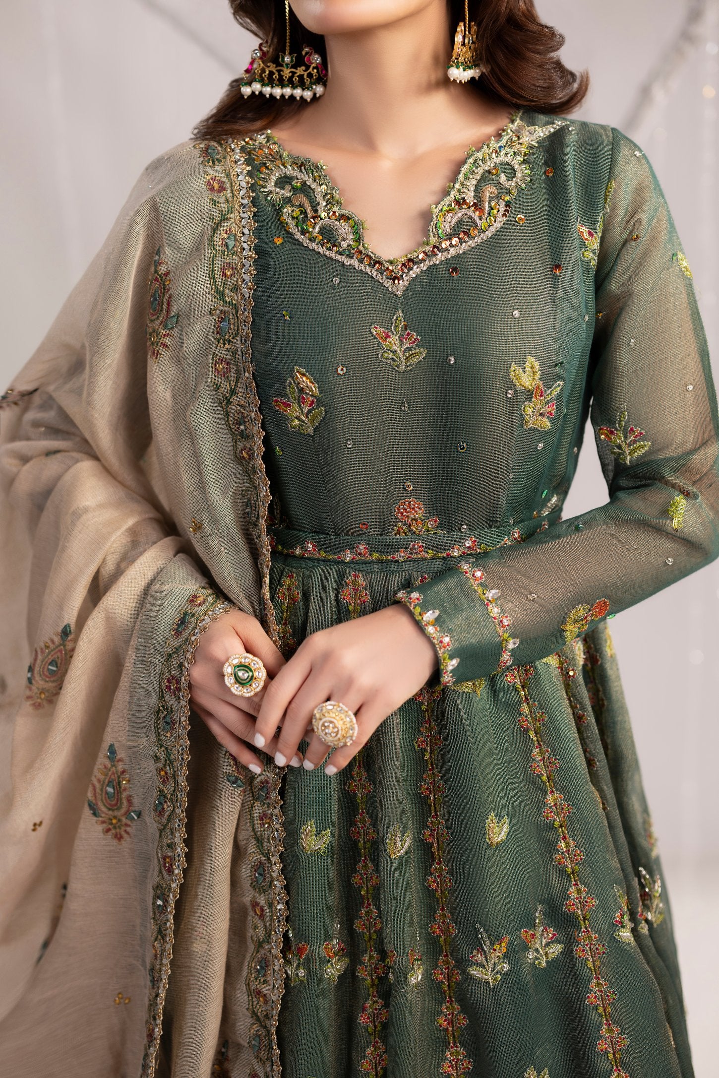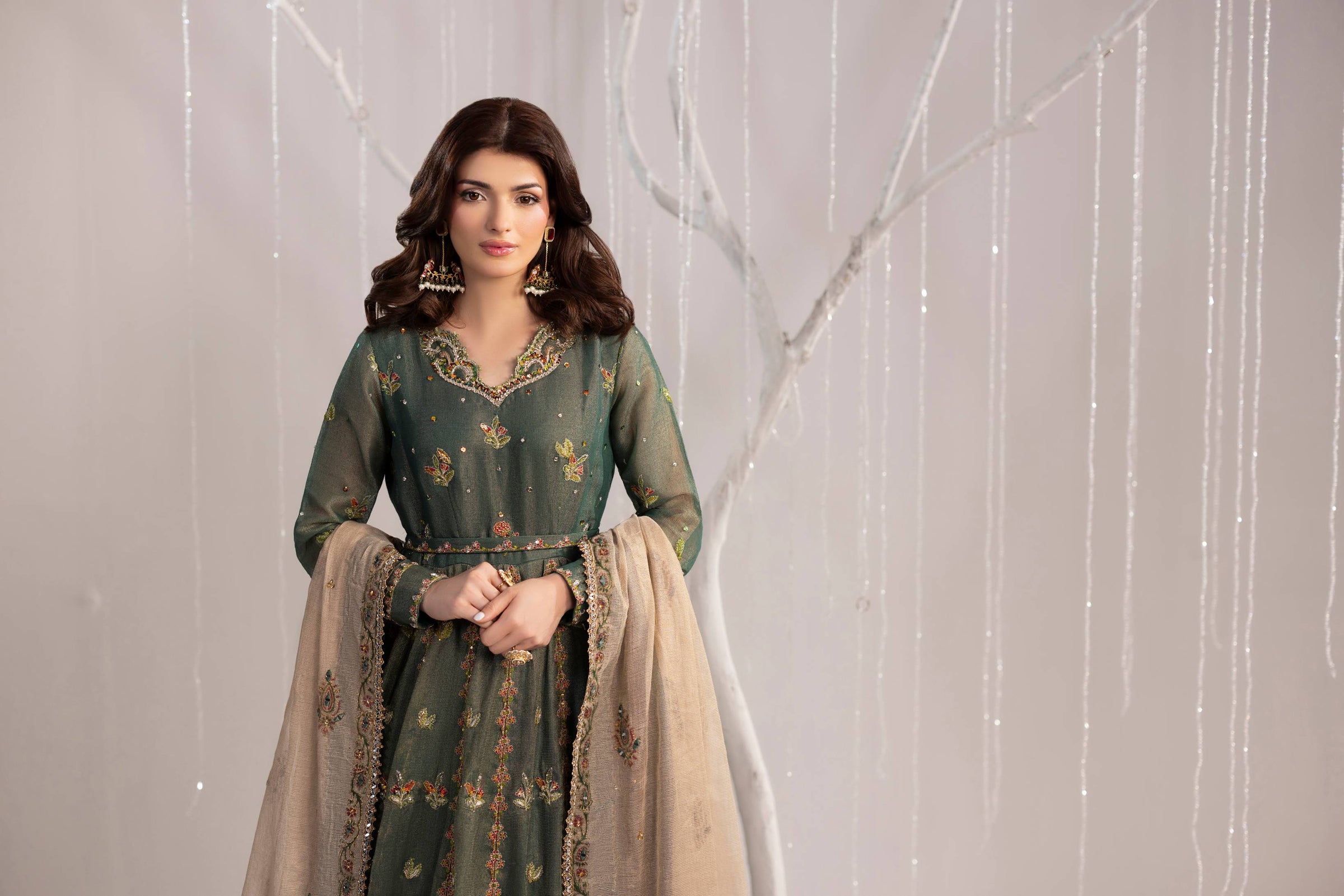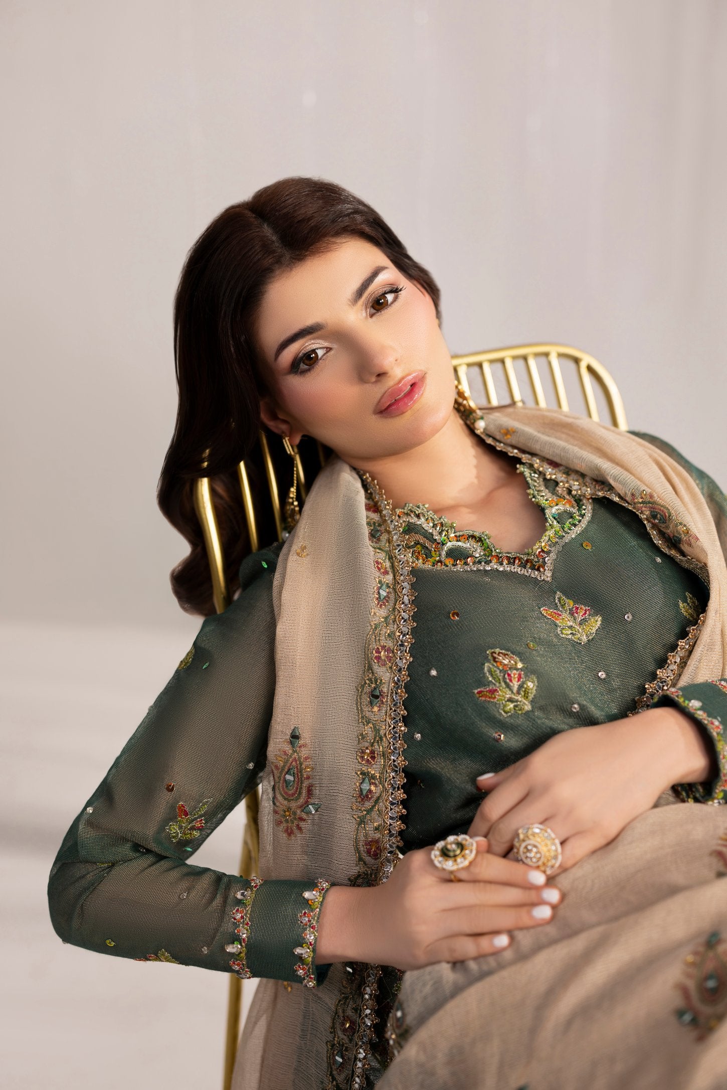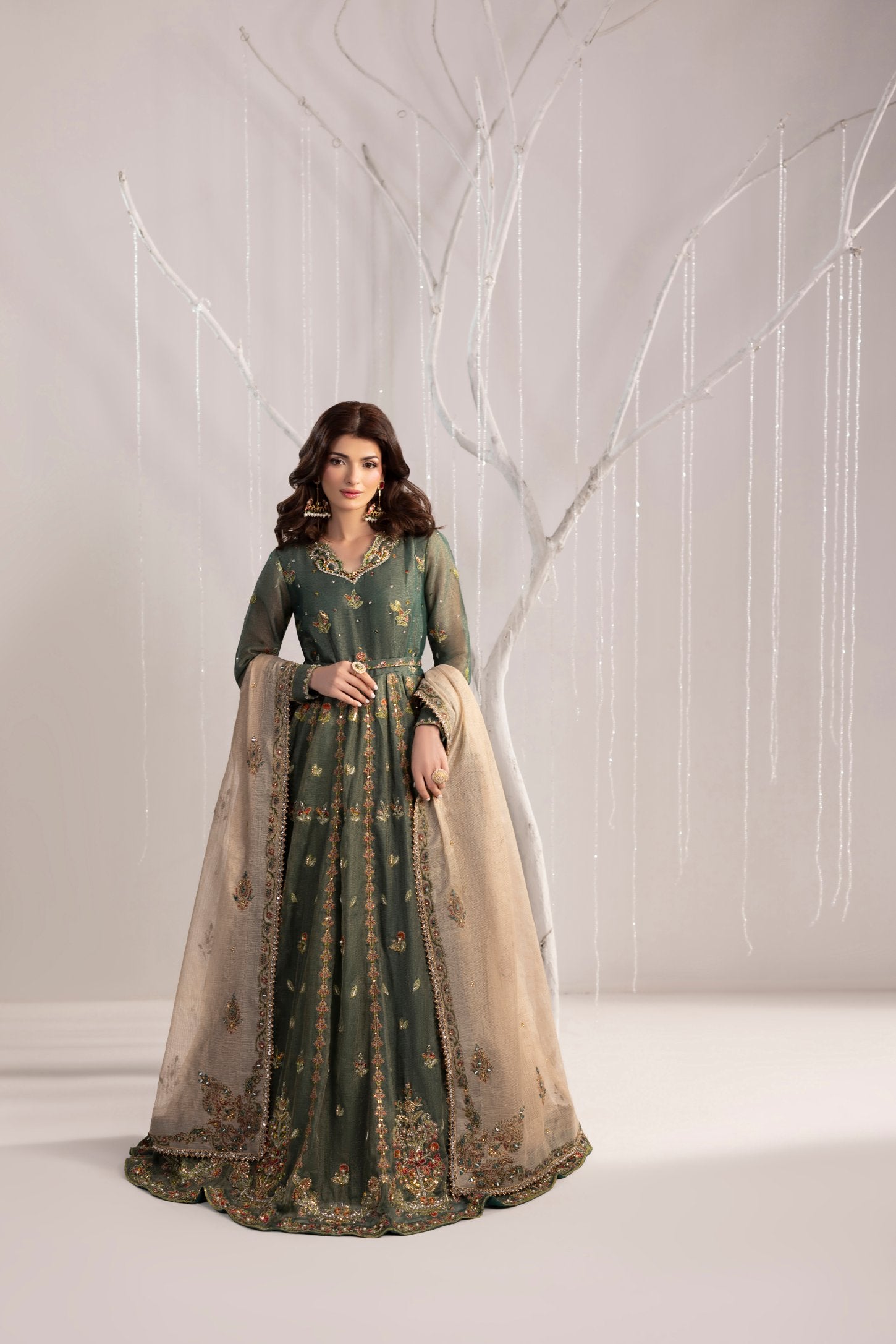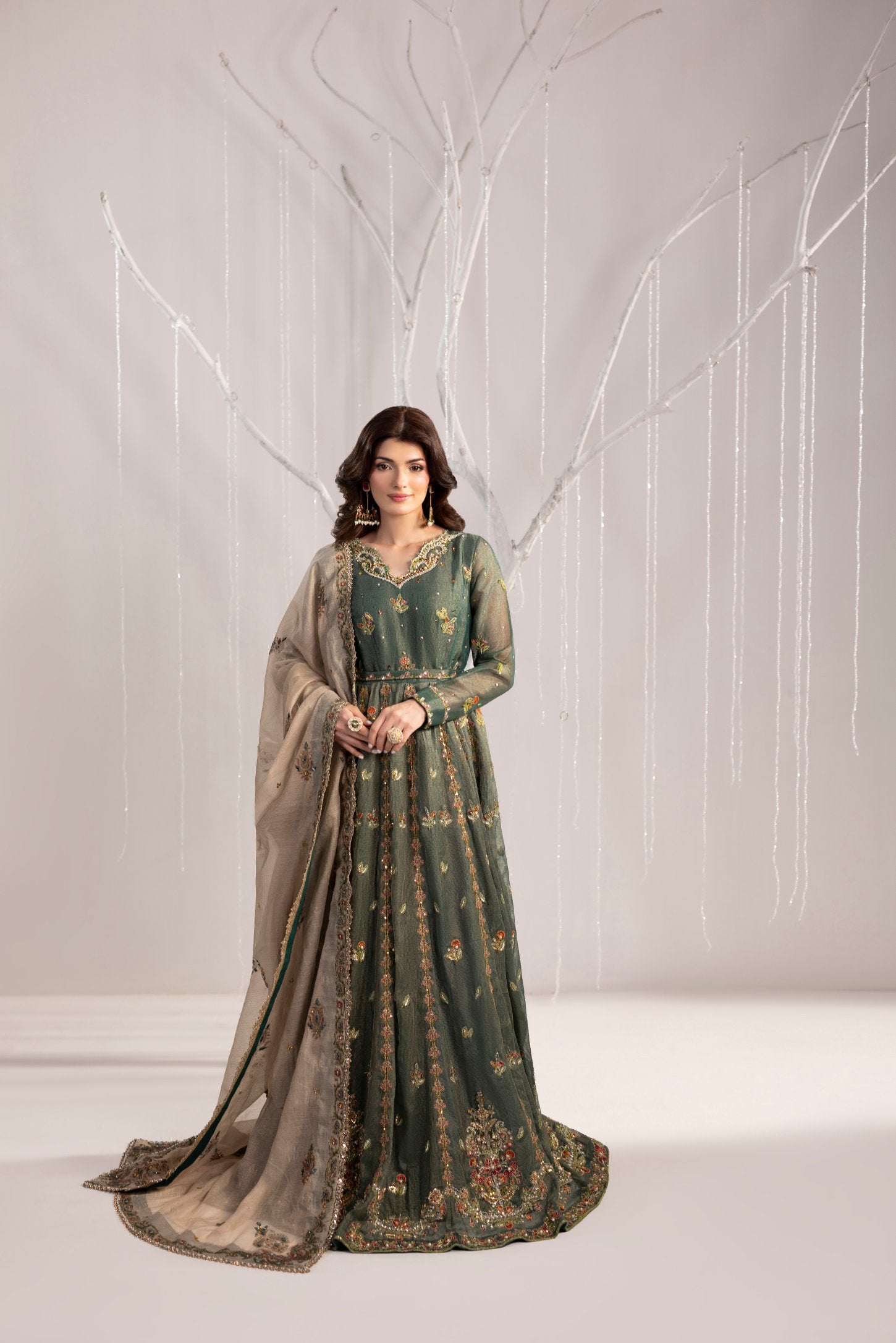 The everlasting and ever so graceful combination of green and gold is once again channeled in Emerald Whisper. Made especially on fine zari cotton net, this green maxi gown is perfect for very occasion with the right amount of embellished charm. Each floral detail tells a story of beauty and elegance while gold subdues its aura. Sequins mimic radiance while crystals sparkle. Fourteen beautifully made and tailored panels complete the flair. A gorgeous dull gold dupatta is paired for the perfect combination and the wow factor to every ensemble with silk trousers.
