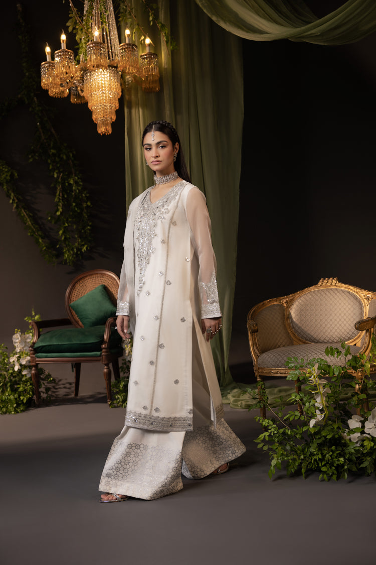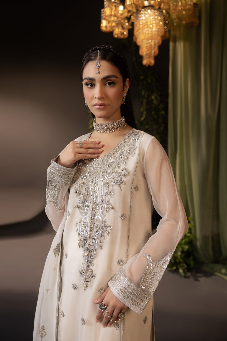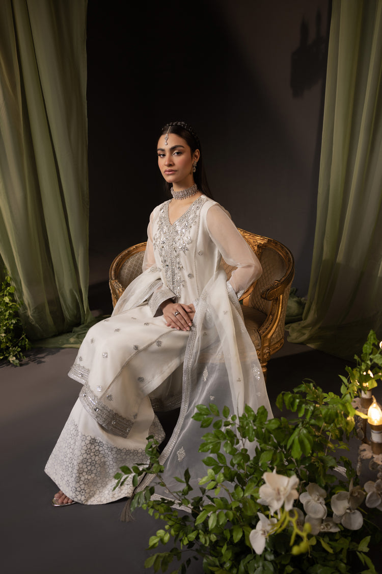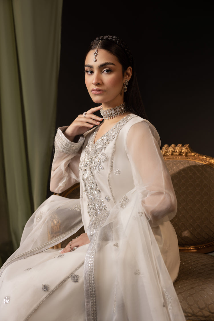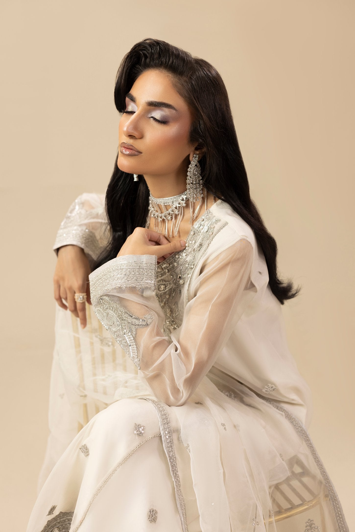 Creating opulence like no other, ‘Jasmine’ is purity itself. Made on organza, the shirt and dupatta are fully embroidered with twinkling chandi tilla and hints of shimmery sitara. Hand applied pearls, stones and sequins make the shirt one of a kind, paired with block printed raw silk trousers.