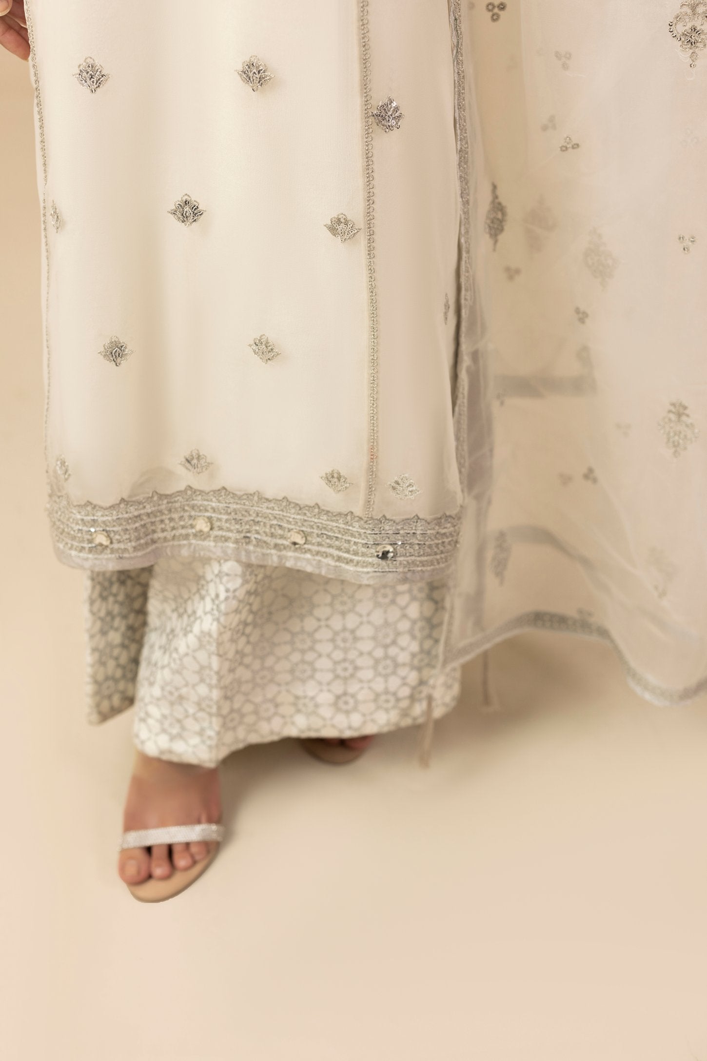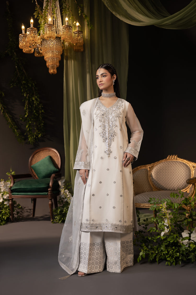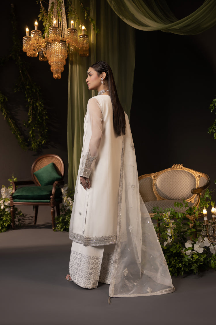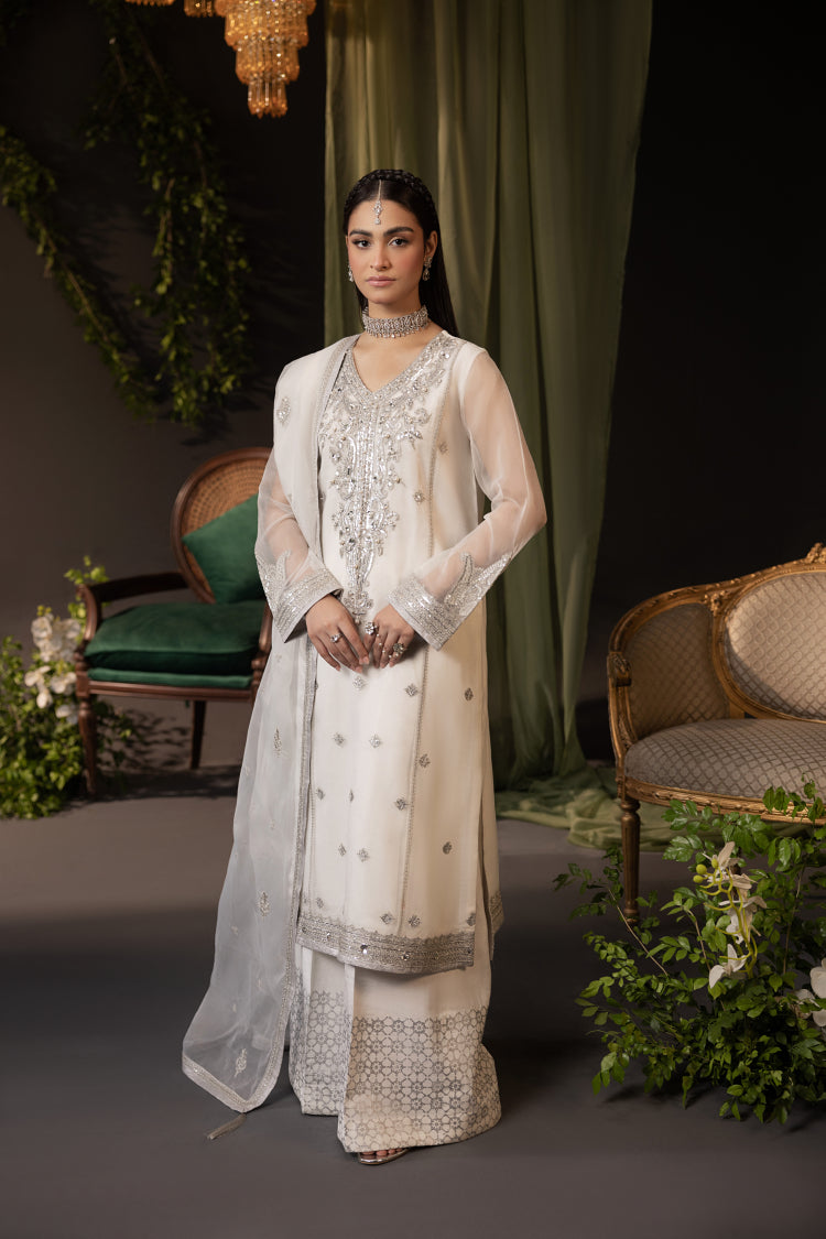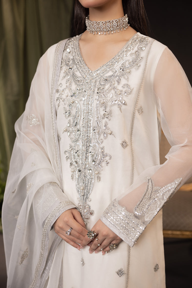 Creating opulence like no other, ‘Jasmine’ is purity itself. Made on organza, the shirt and dupatta are fully embroidered with twinkling chandi tilla and hints of shimmery sitara. Hand applied pearls, stones and sequins make the shirt one of a kind, paired with block printed raw silk trousers.