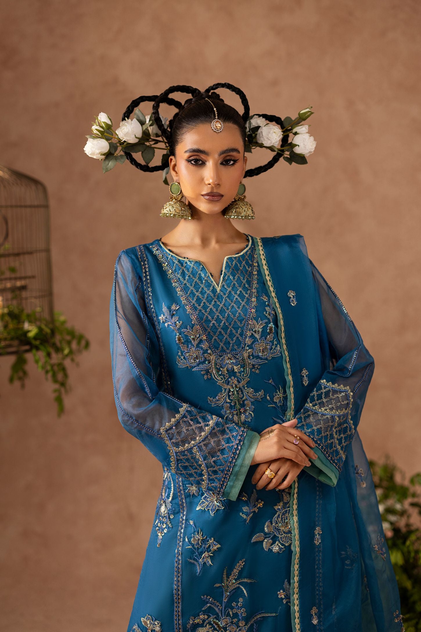 Grace meets sophistication with Jugni a breathtaking blue ensemble featuring a handworked organza shirt, adorned with intricate dabka, naqshi, and sequin detailing. Paired with a sleek Pk silk trouser and a flowing organza dupatta, Jugni is a masterpiece that exudes charm and timeless elegance.