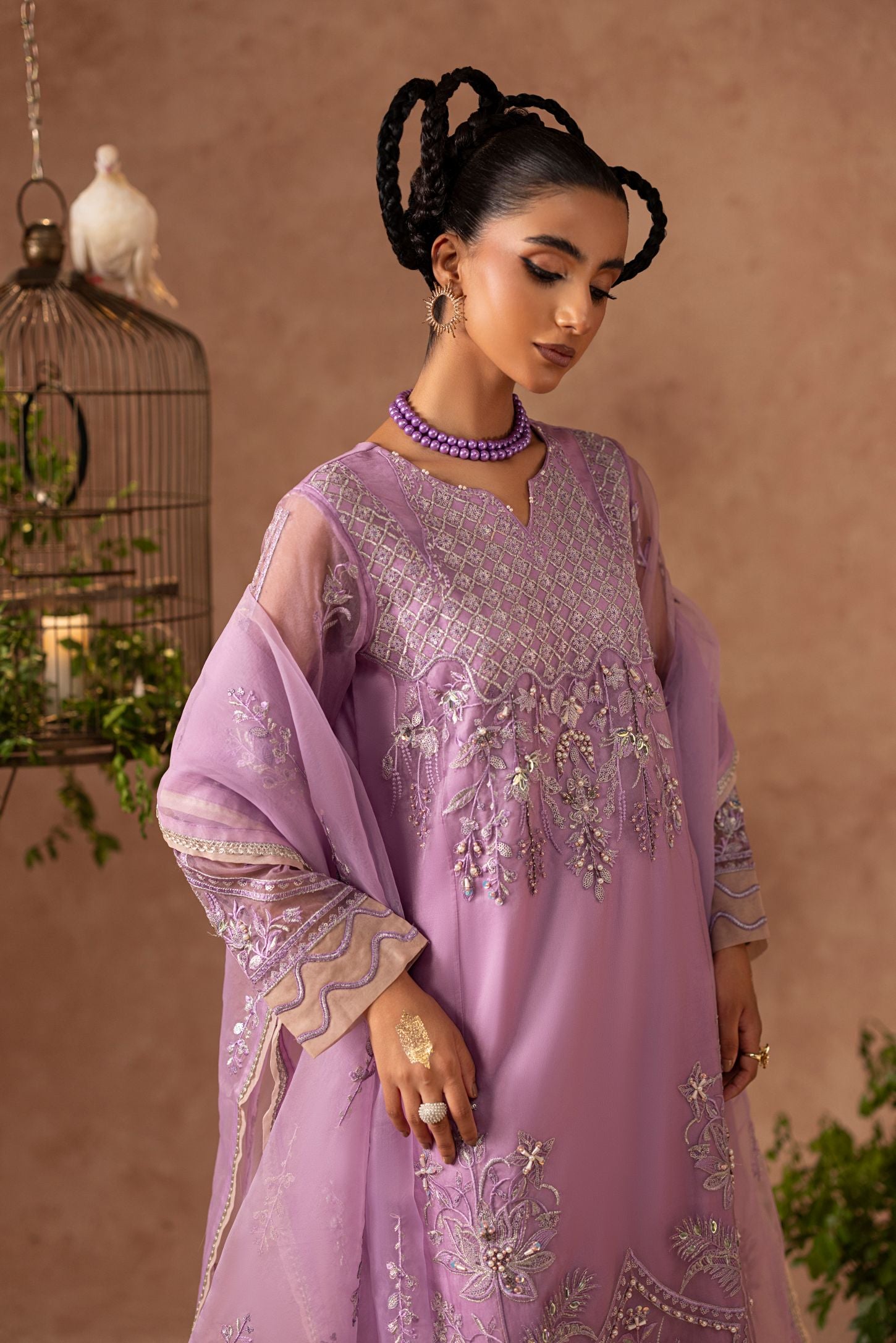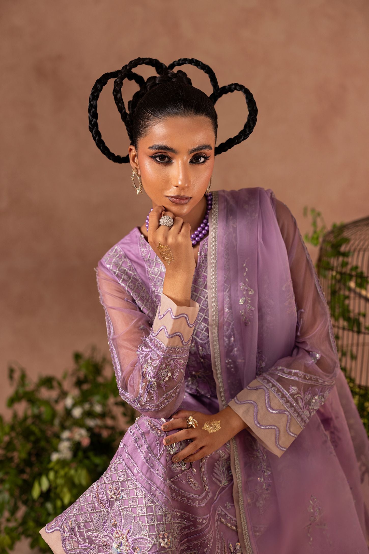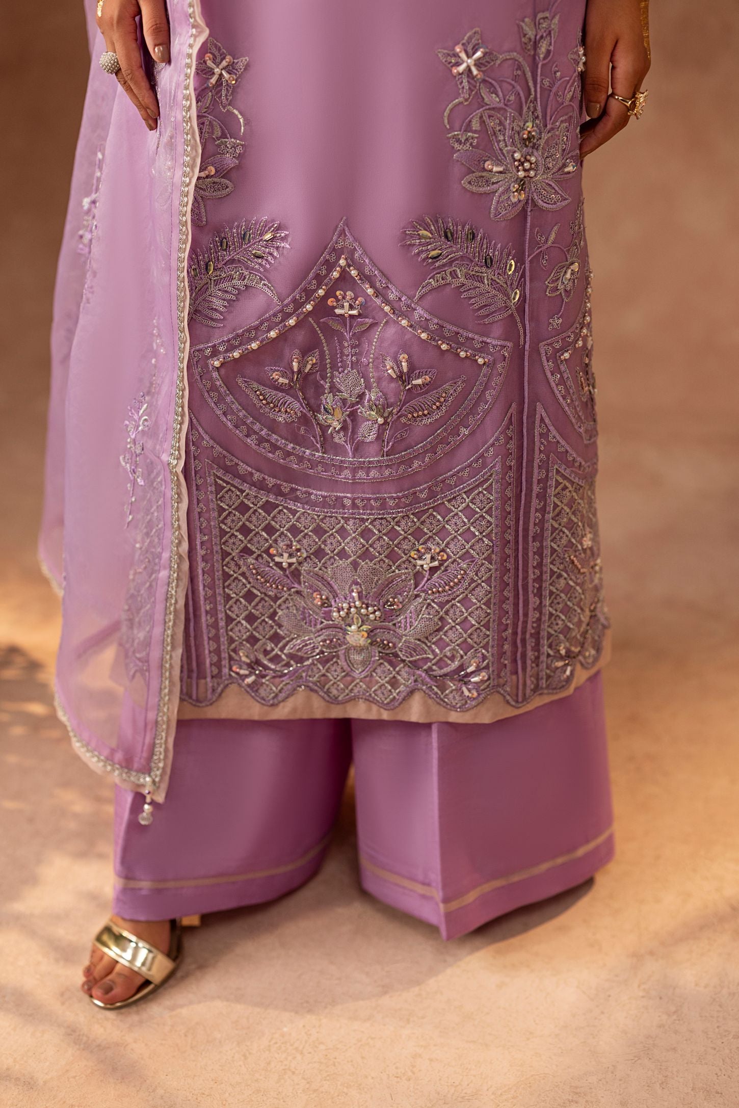 Ragni enchants in a regal purple hue. The organza shirt features exquisite handwork with dabka, naqshi, and sequin detailing, exuding sophistication. Paired with a Pk silk trouser and a flowy organza dupatta, Ragni is perfect for making unforgettable memories.