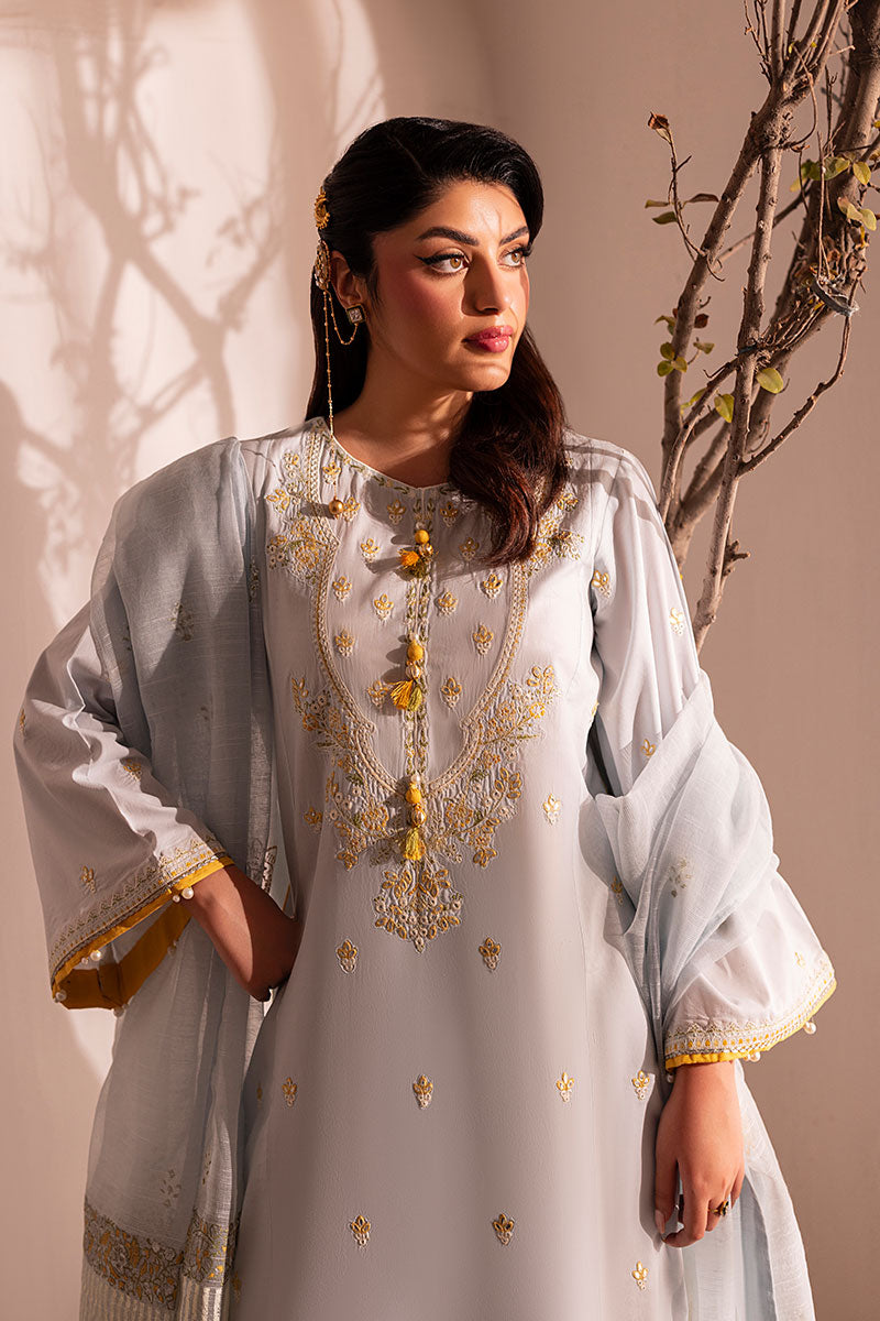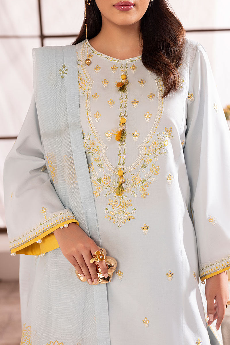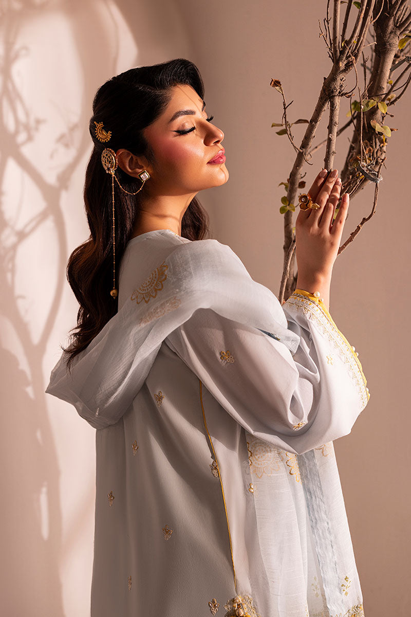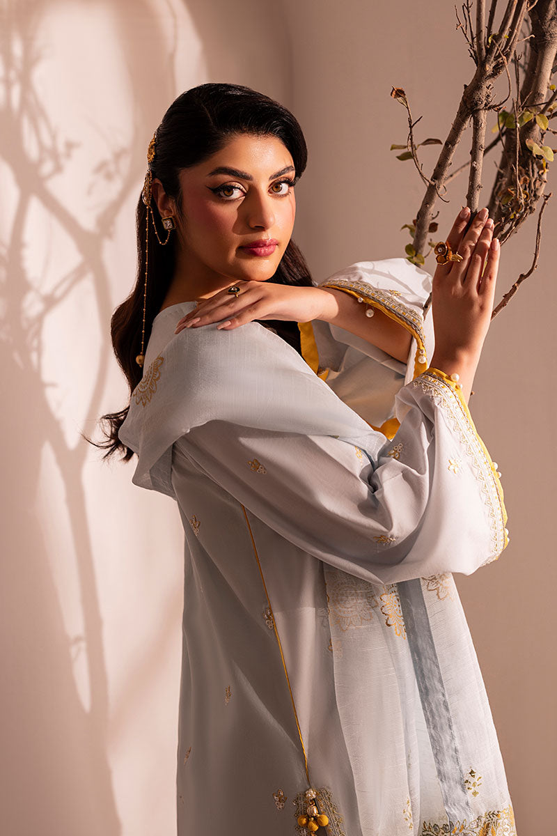 Delicate and soft as her name, Skye is a breath of fresh air. Made with a shade of cool soft blue on breathable lawn; this ensemble has contrasting resham embroideries throughout the shirt and trouser with a warm shade of yellow, earthy green and opulent white. The neckline has a very traditional ornate look with custom made buttons for an exuberant finish. A stunning slub dupatta completes this ensemble with all custom block printed ornamentation.
