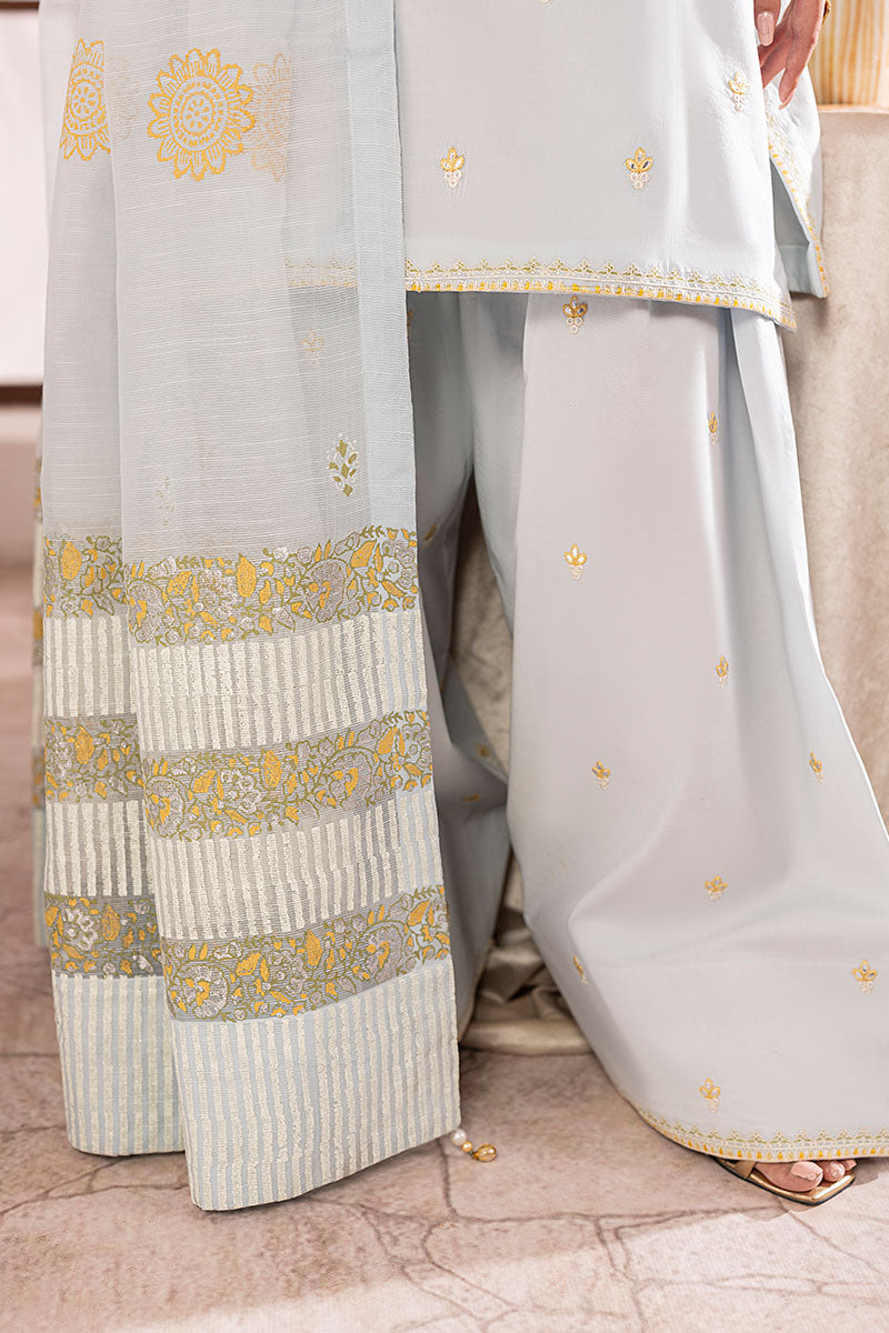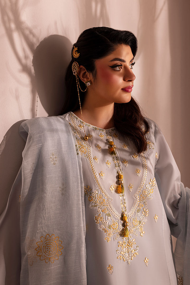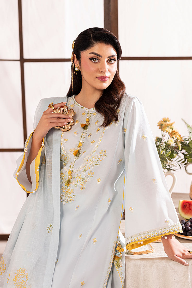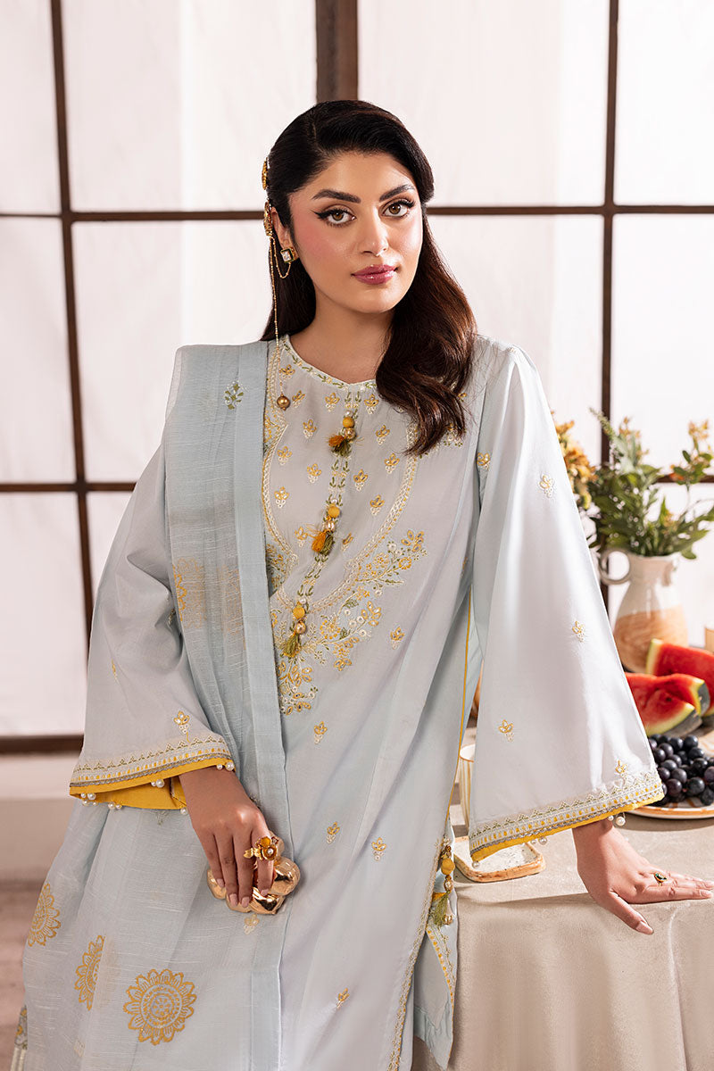Delicate and soft as her name, Skye is a breath of fresh air. Made with a shade of cool soft blue on breathable lawn; this ensemble has contrasting resham embroideries throughout the shirt and trouser with a warm shade of yellow, earthy green and opulent white. The neckline has a very traditional ornate look with custom made buttons for an exuberant finish. A stunning slub dupatta completes this ensemble with all custom block printed ornamentation.