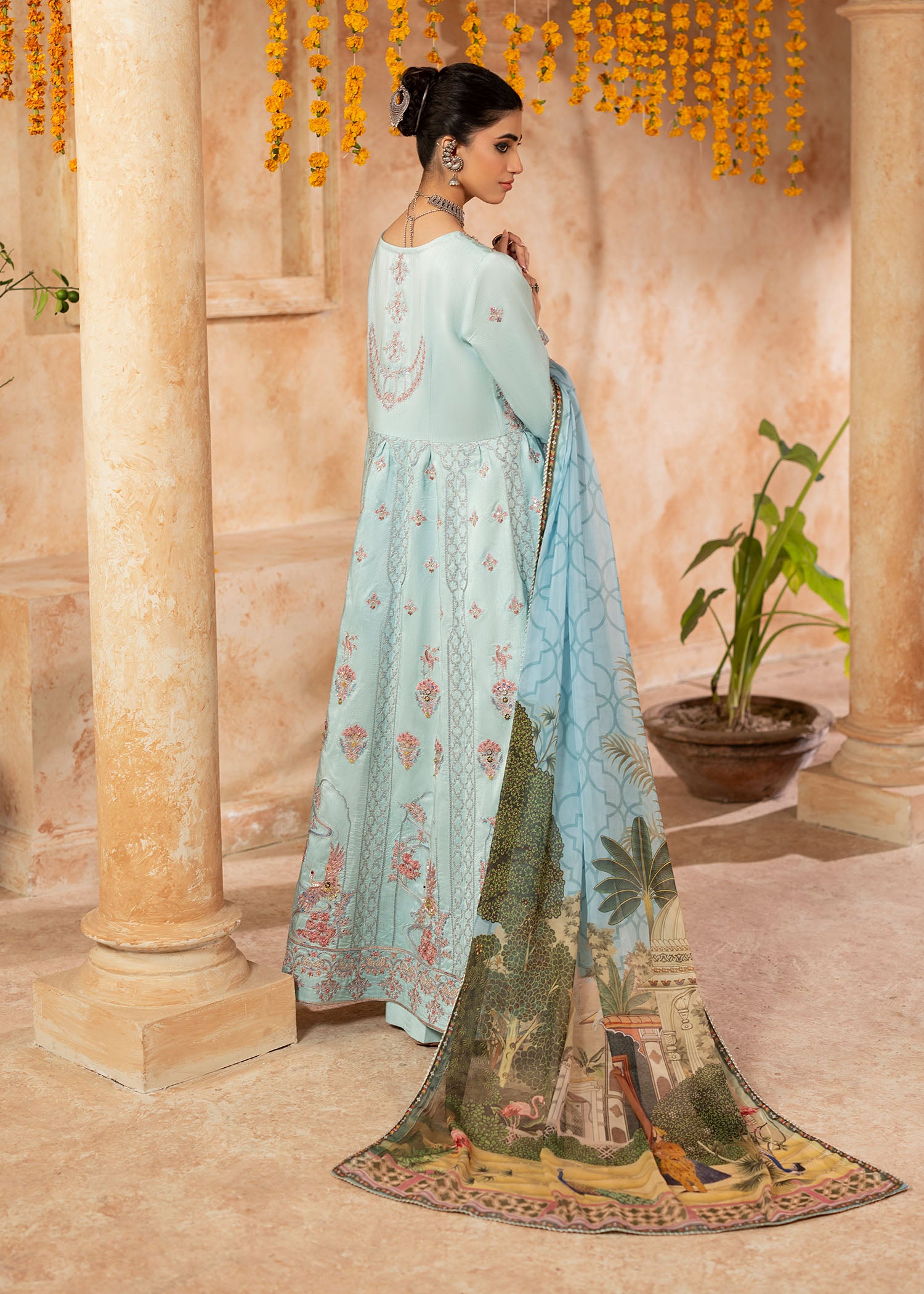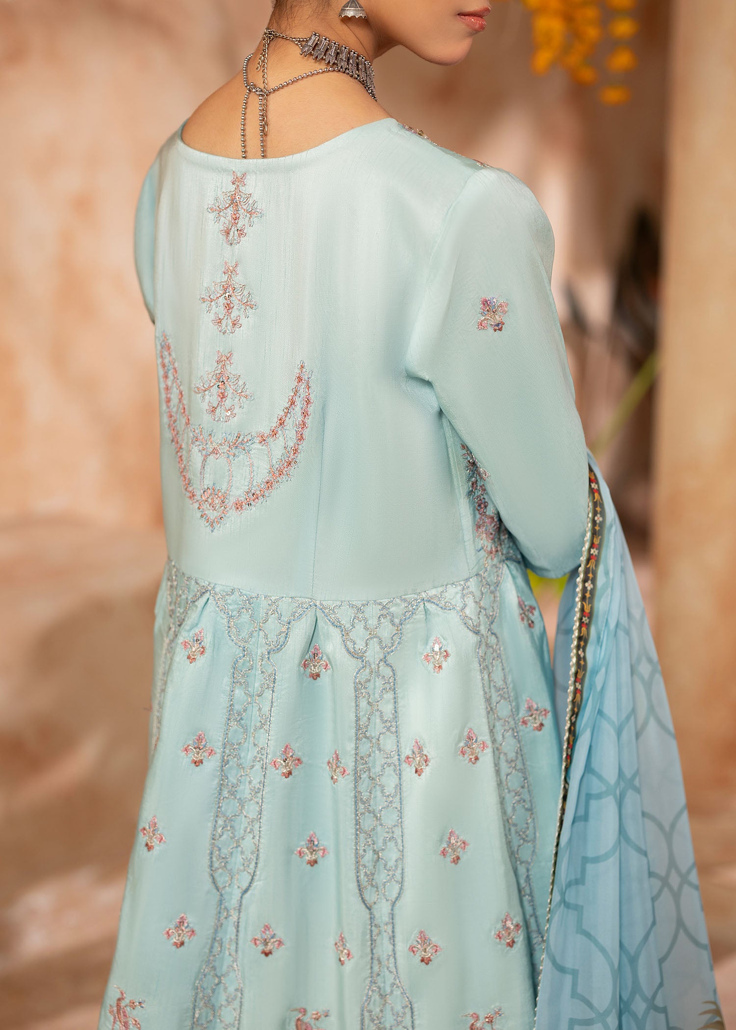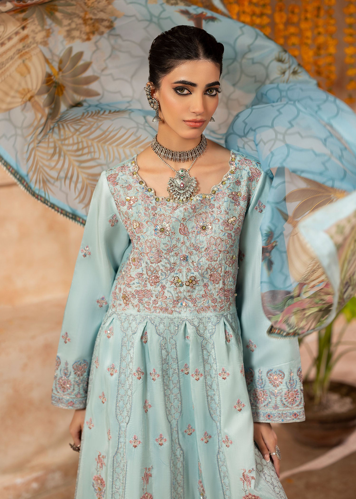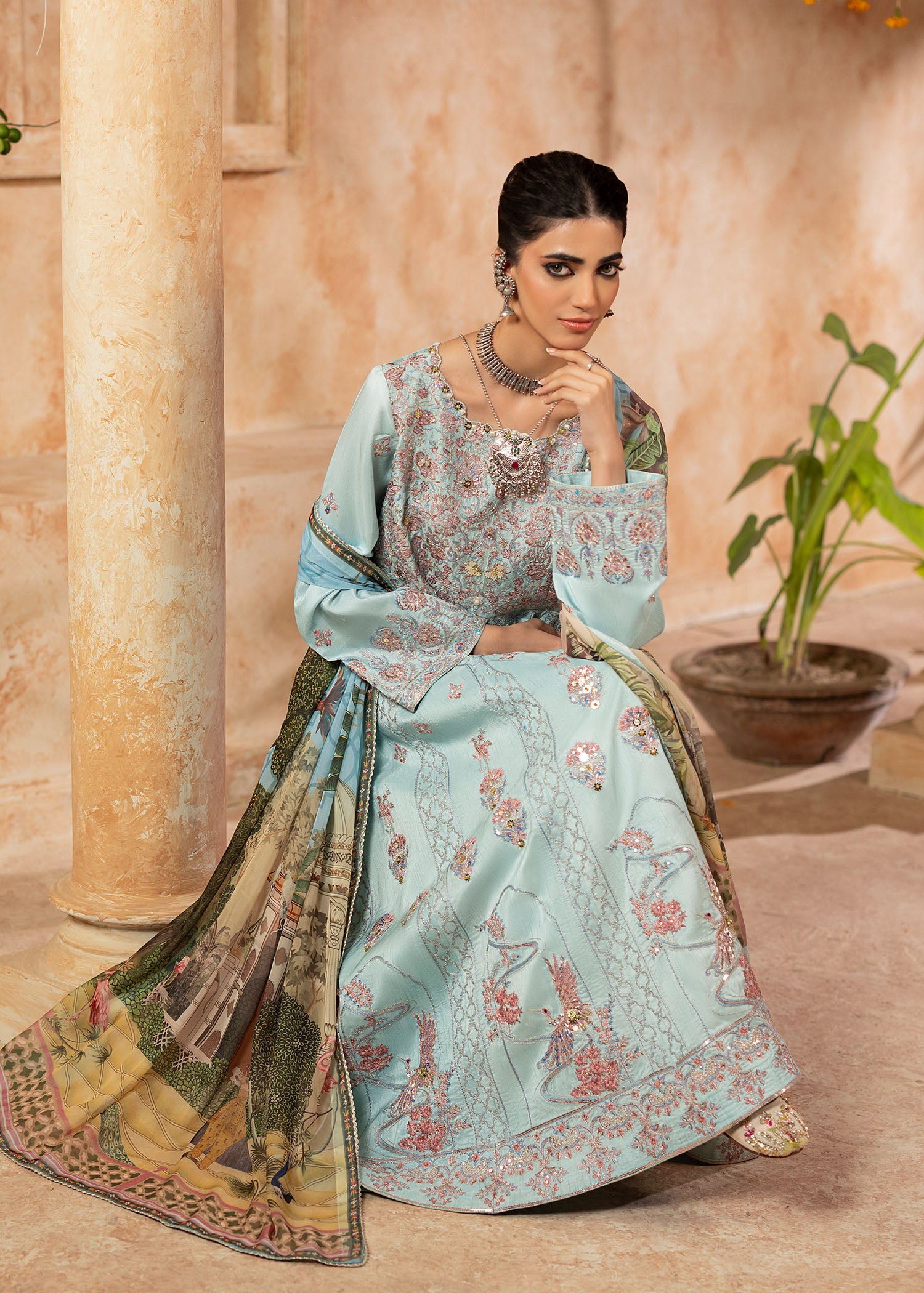 Mystically stunning, Qutub Minar embodies inner beauty with a unique traditional style. Inspired by the classic pishwas; a soft sky blue silk base sets stage to intricate floral embroideries with geometric Mughal patterns all over. Sequins and pearls beautify each element with plain silk trousers. A soft digital printed silk dupatta with a custom Shurooq print echoes stories of the past making Sufi an evergreen beauty