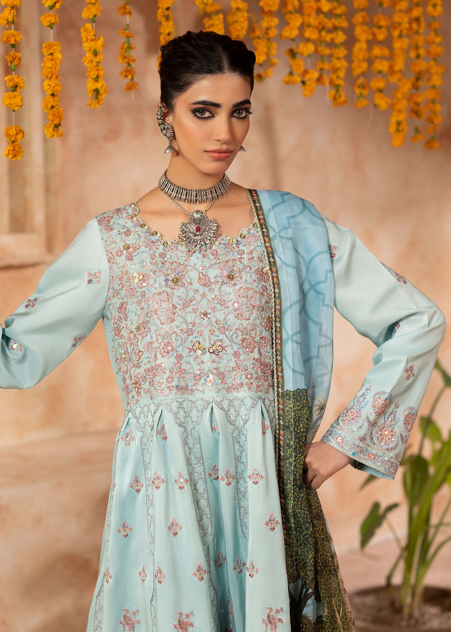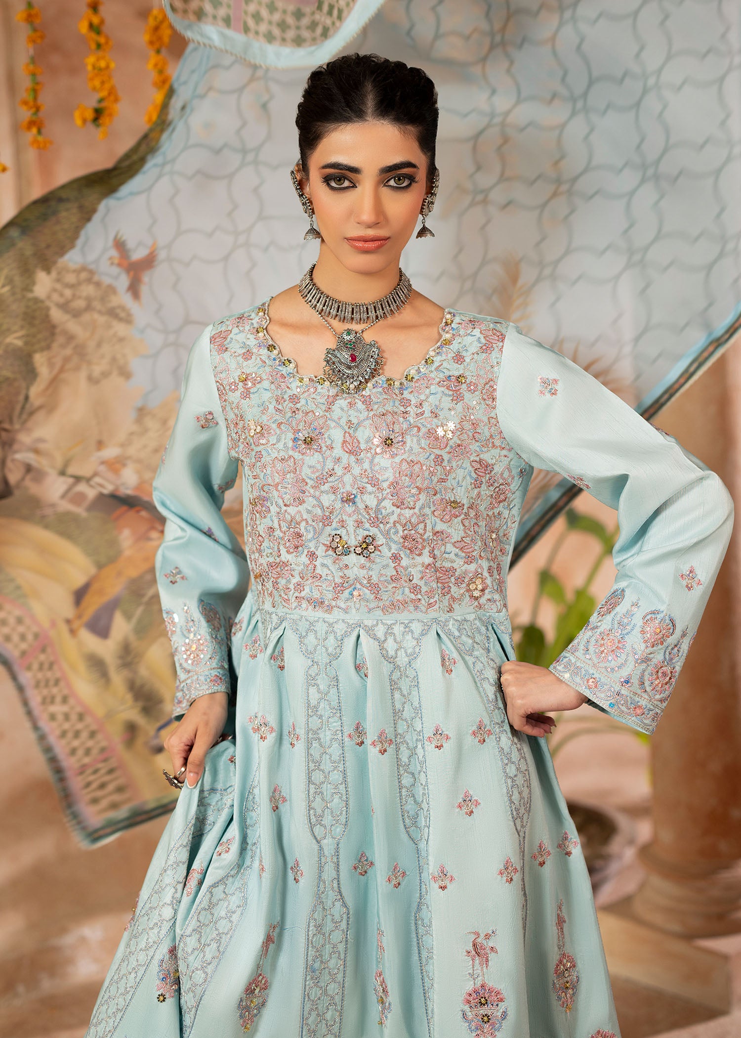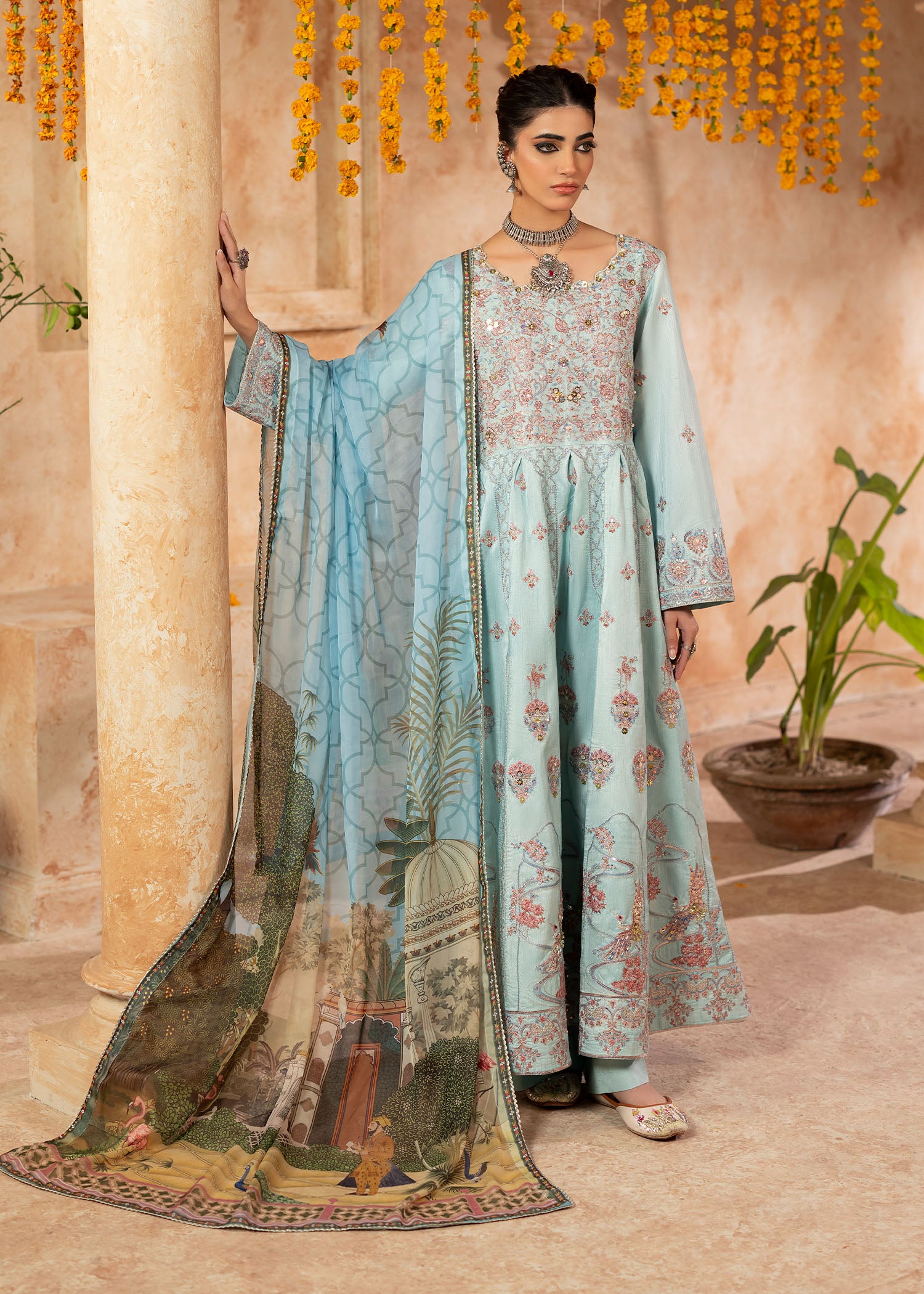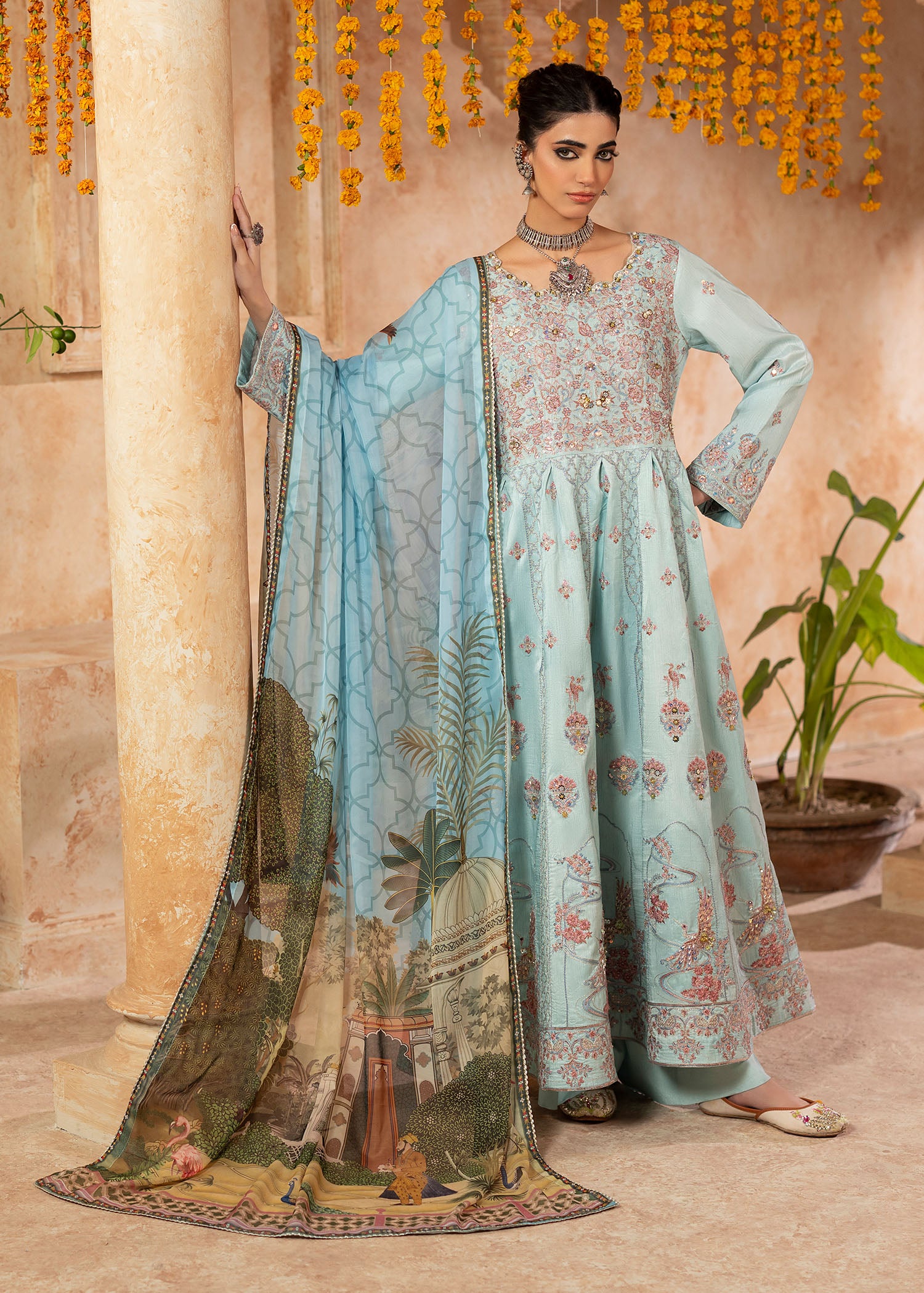 Mystically stunning, Qutub Minar embodies inner beauty with a unique traditional style. Inspired by the classic pishwas; a soft sky blue silk base sets stage to intricate floral embroideries with geometric Mughal patterns all over. Sequins and pearls beautify each element with plain silk trousers. A soft digital printed silk dupatta with a custom Shurooq print echoes stories of the past making Sufi an evergreen beauty