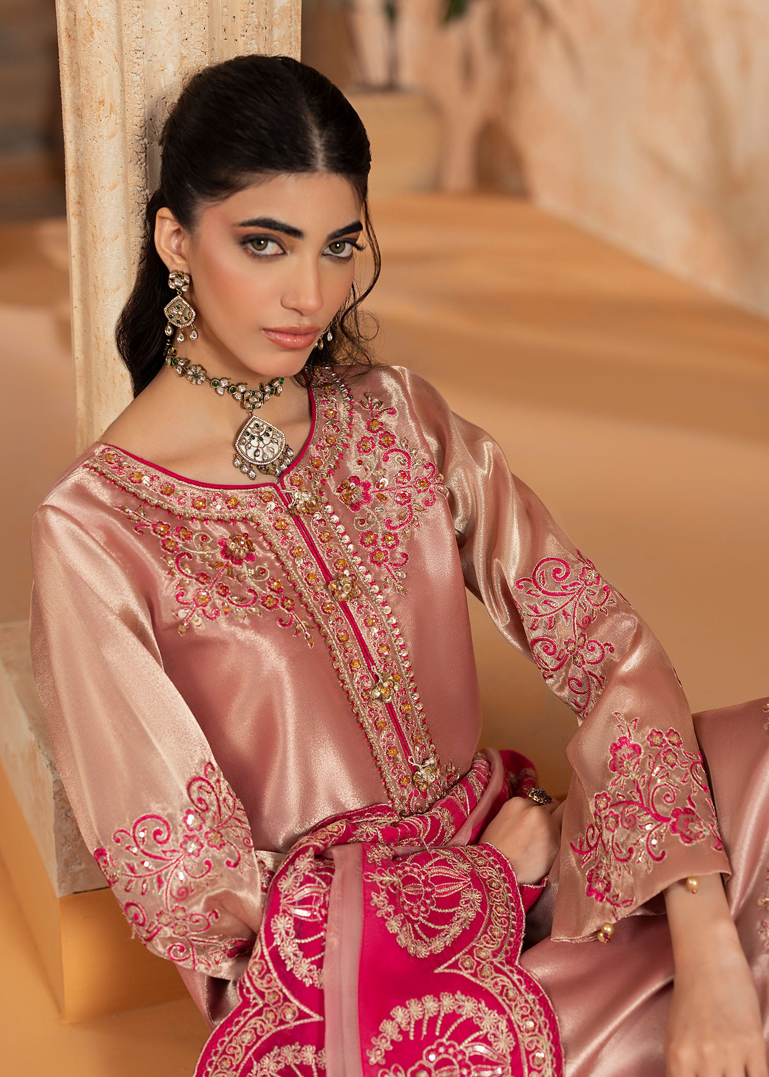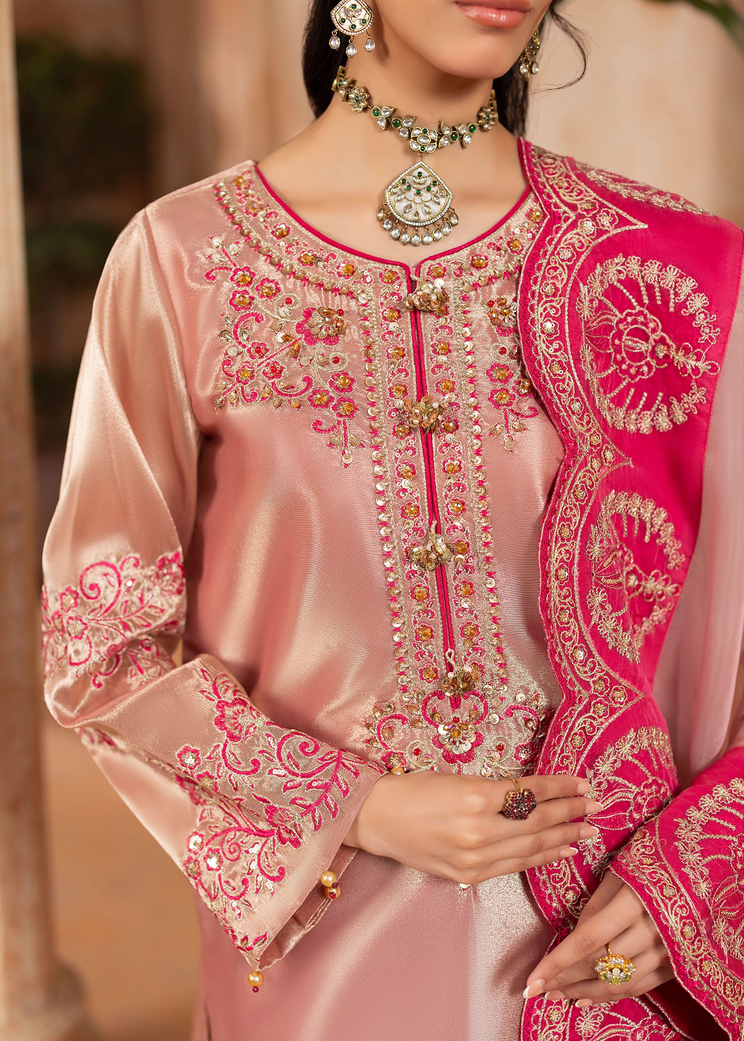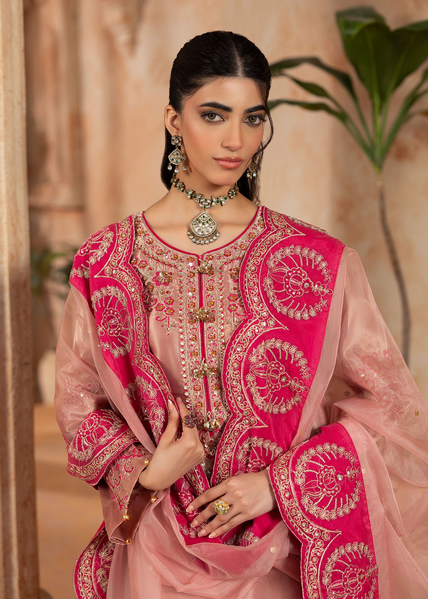 Mesuri rose gold has never looked as enchanting as with Sukan. A classic take on eastern festivewear stylised as the ultimate Shurooq signature ensemble. The heavily embroidered neckline, hem and sleeves are glamourised with hand applied embellished details. The matching organza duappata has a spray of shimmering sequins with a thick fuchsia pink embroidered border to be a showstopper at any moment.
