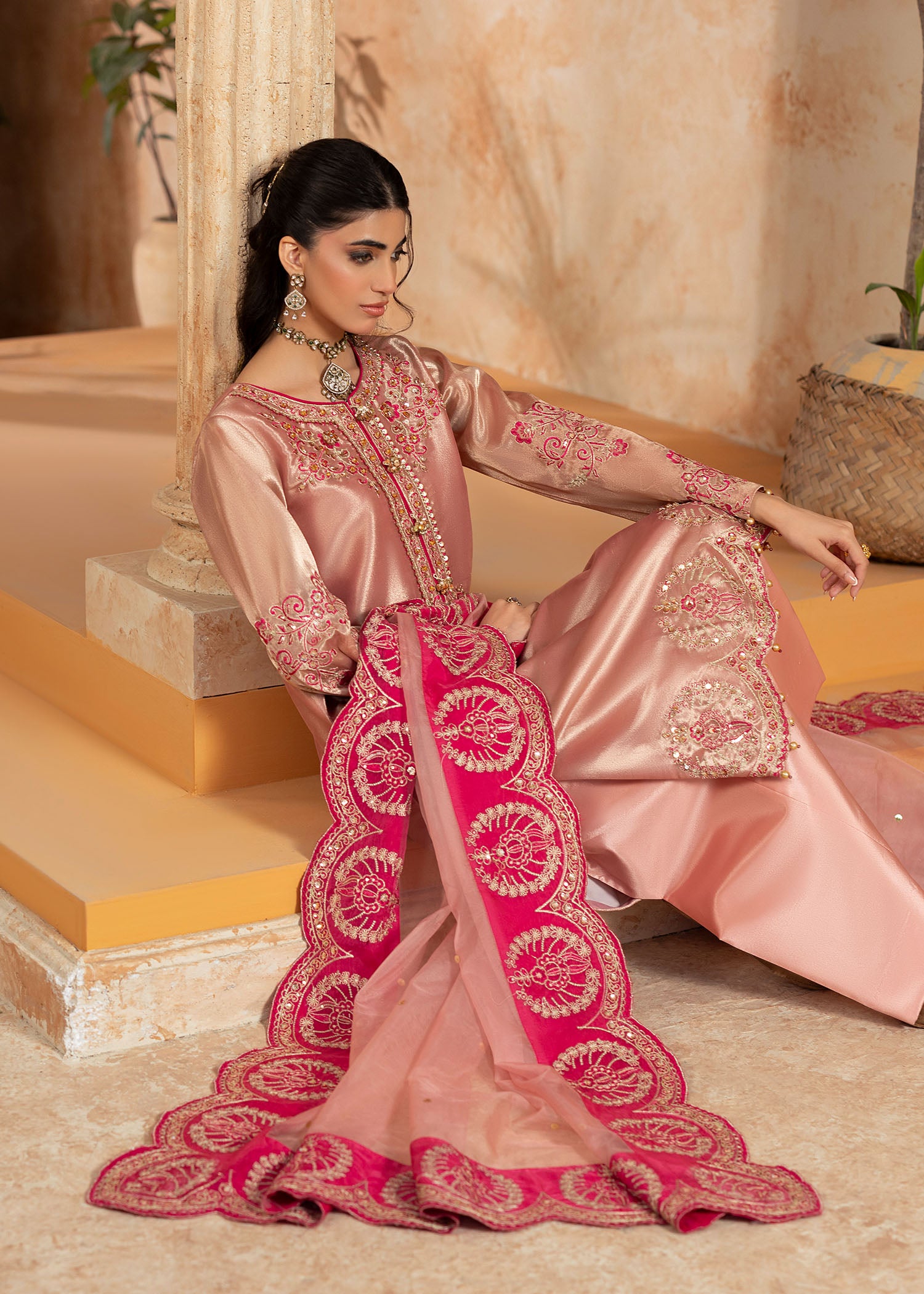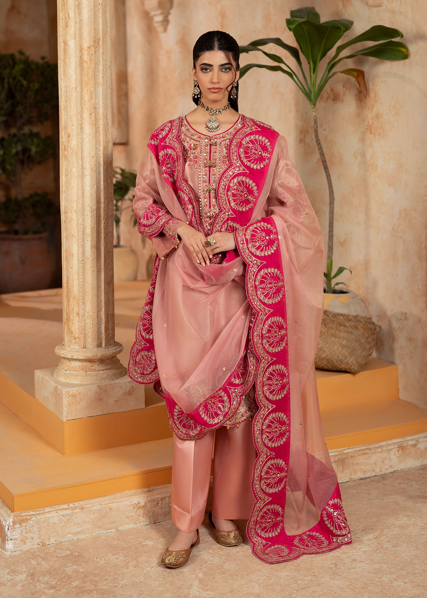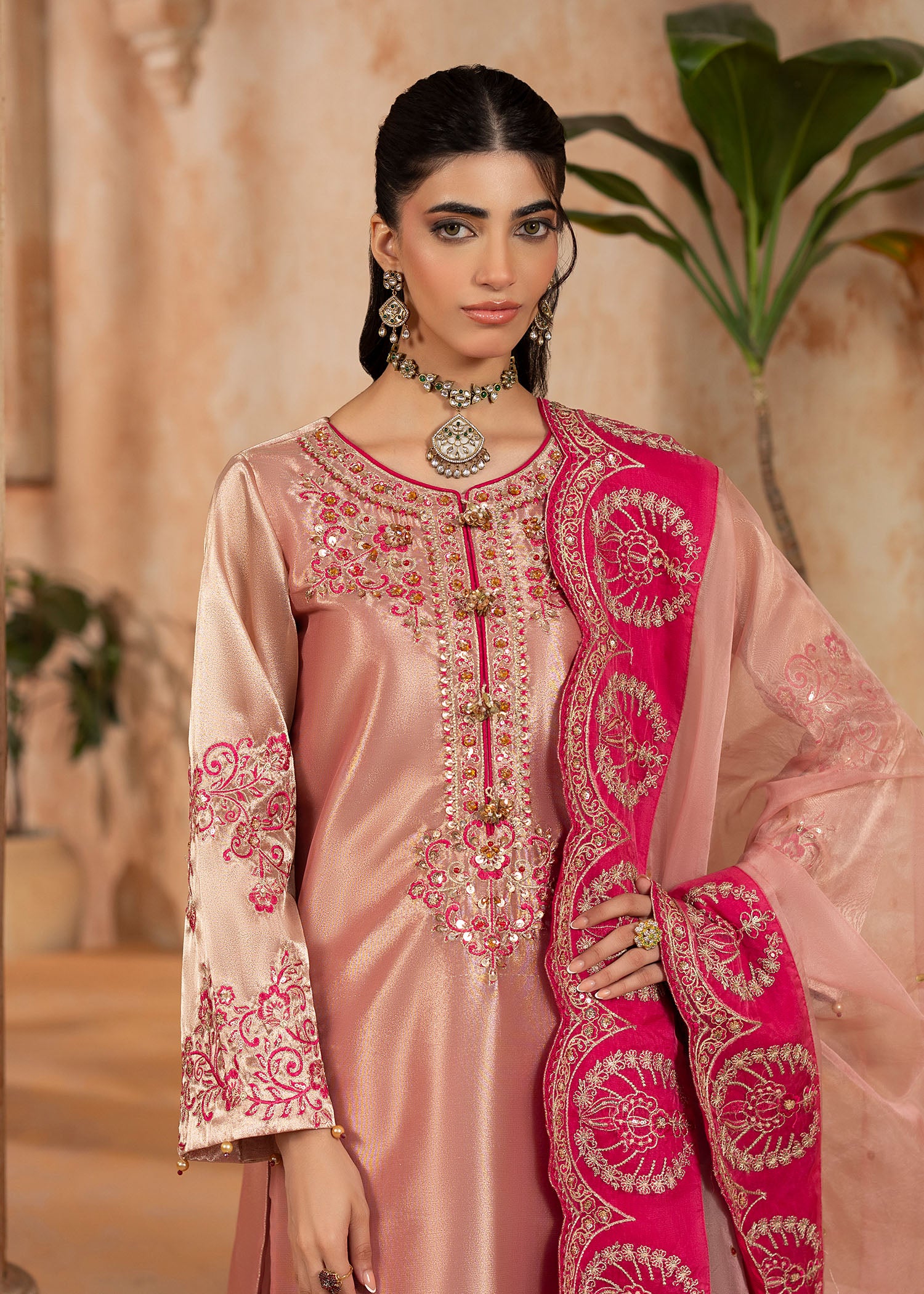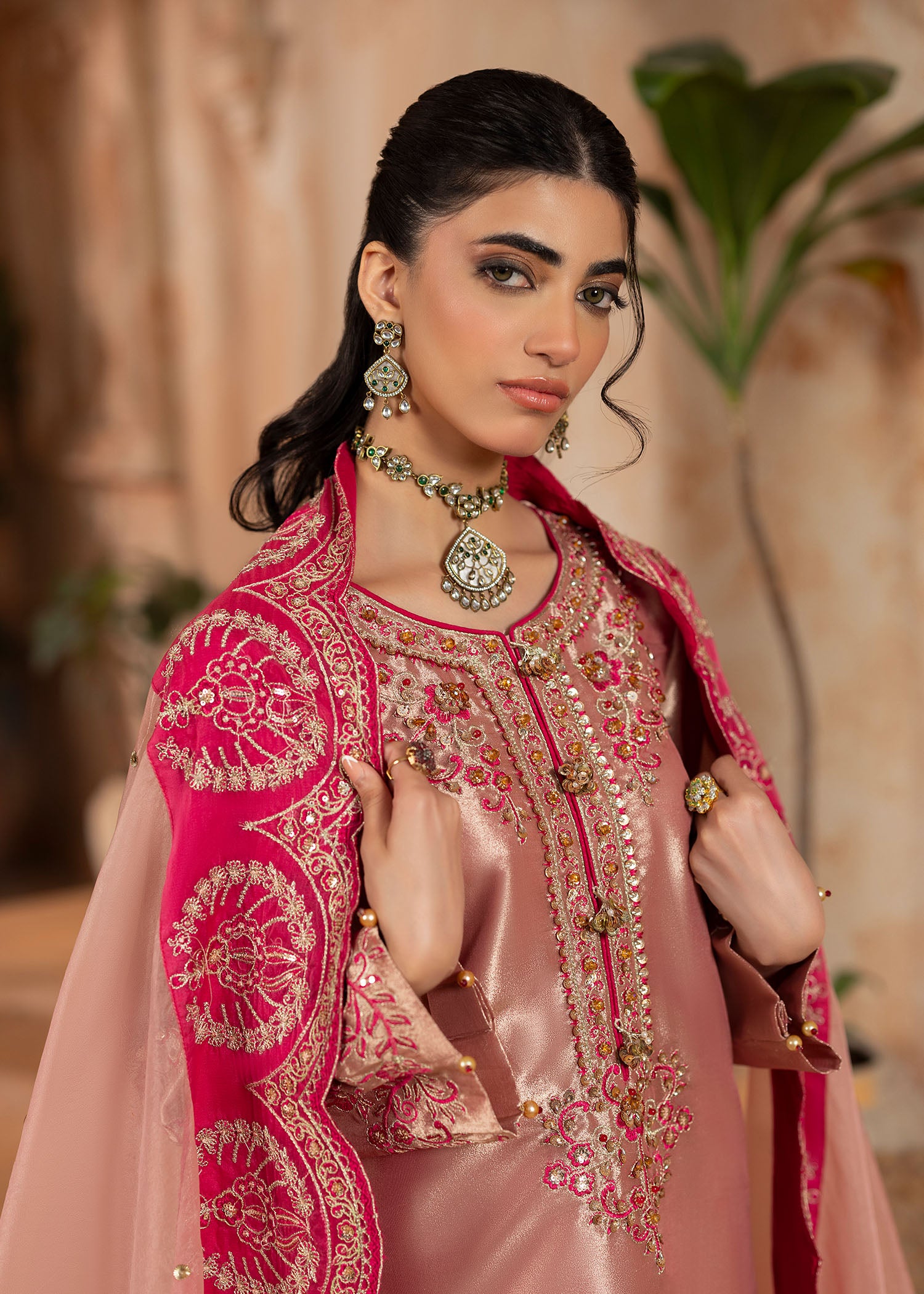 Mesuri rose gold has never looked as enchanting as with Sukan. A classic take on eastern festivewear stylised as the ultimate Shurooq signature ensemble. The heavily embroidered neckline, hem and sleeves are glamourised with hand applied embellished details. The matching organza duappata has a spray of shimmering sequins with a thick fuchsia pink embroidered border to be a showstopper at any moment.